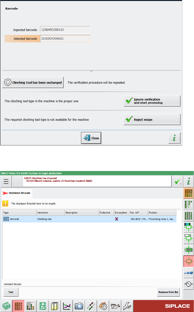 Station Software 7xx to 714.0 (R20-2) / Feature Description 11/2020 Edition 281 Table 15 -1: Displayed error mess age if barcode information does n ot match recipe In the Hardware fiducials tab of the Current machine req…