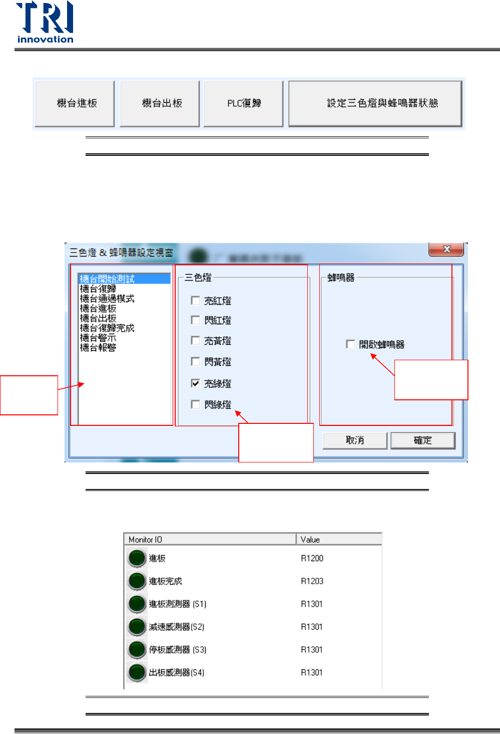 設定三色燈與蜂鳴器狀態:可設定每一個機台行為所對應的三色燈燈號及蜂鳴器是否報警。