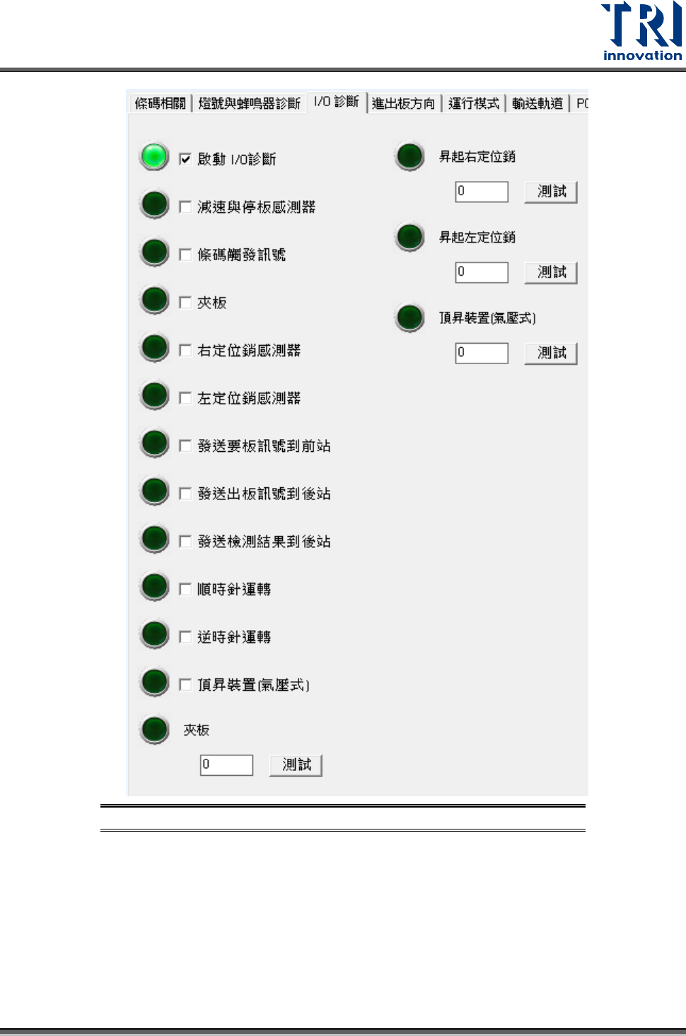 Test Research, Inc. TR7710 Series User G uide – Hardware 11 圖 14 : I/O 診斷介面 減速與停板感測 器:測試減速與停 板感測器電源是否正常顯 示,打勾時感測器會亮綠 燈。 條碼觸發訊號: 手動下觸發訊號讓 硬體條碼器打光取像。 夾板:測試夾板 是否正常。 右定位銷感測器 :測試右邊位銷感 測器動作是否正常。 左定位銷感測器 :測試左邊位銷感 測器動作…