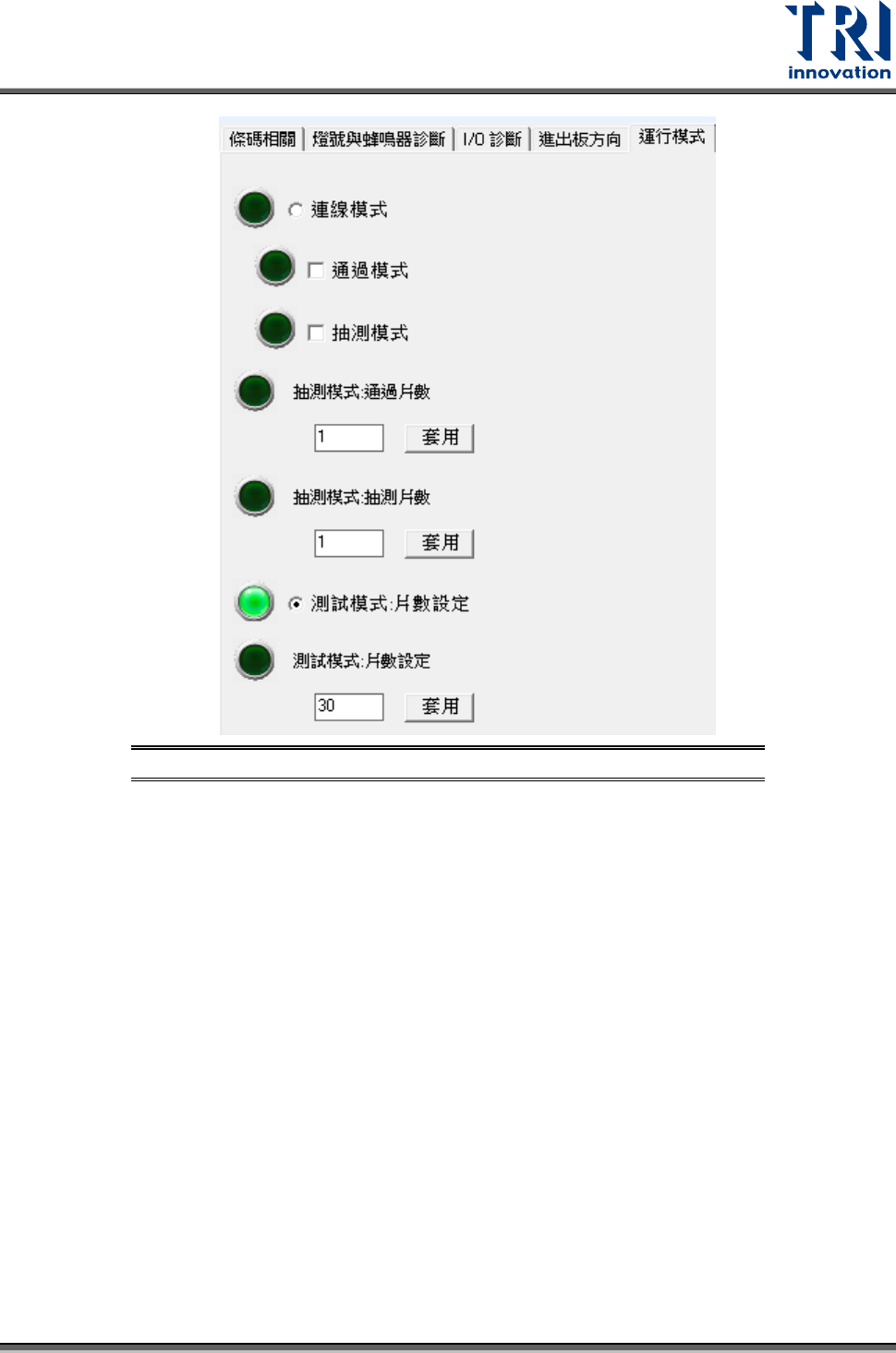 Test Research, Inc. TR7710 Series User G uide – Hardware 13 圖 16 :運行模式介面 連線模式:一般 生產模式,可增加 設定通過模式及抽測模式 。 通過模式:不檢 測直接通過,當軌 道使用。 抽測模式:一般 為產線生產來不及 檢測時可採取抽測模式, 可設定通過幾片、測試幾 片來減輕生產線負擔或 兩機台串連時使用。 抽測模式 -- 通過片數 :設 定通過片數數量 …