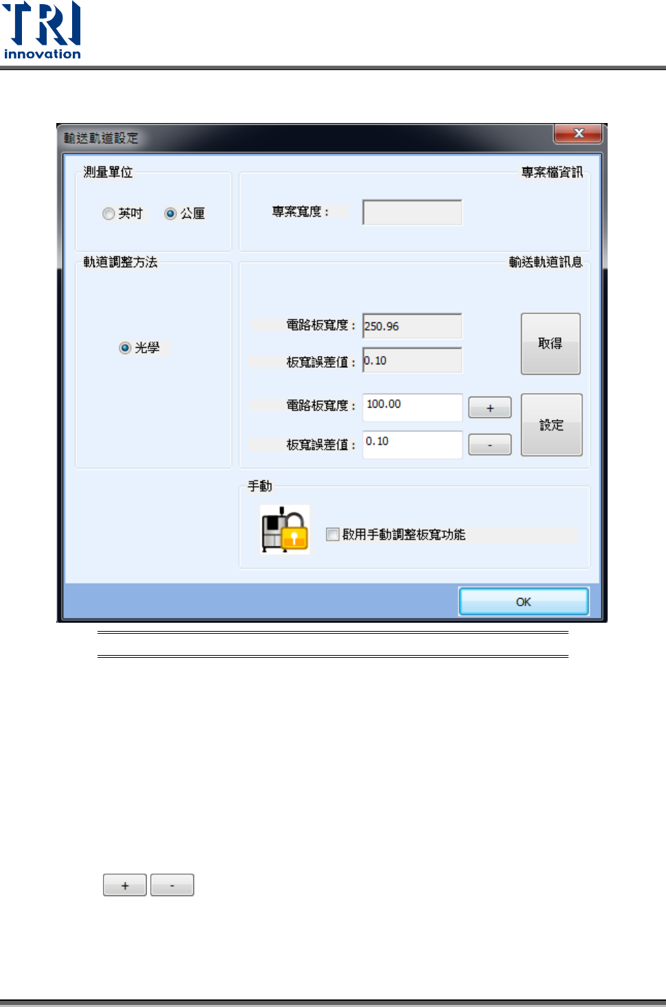 − 板寬誤差值 :如果軌道寬度直接設定為板子寬度會造成無法進板情形,所以設定