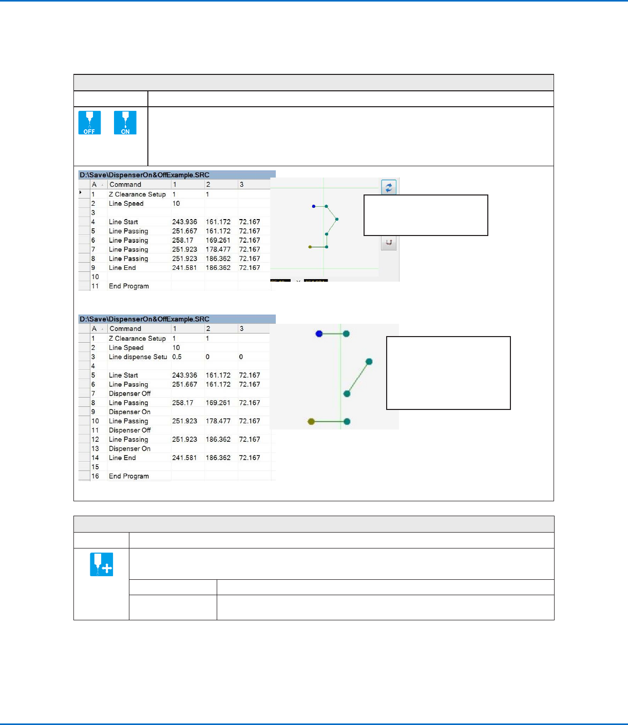 Program with Dispenser On / Dispenser Off commands and an example of the resulting dispense pattern