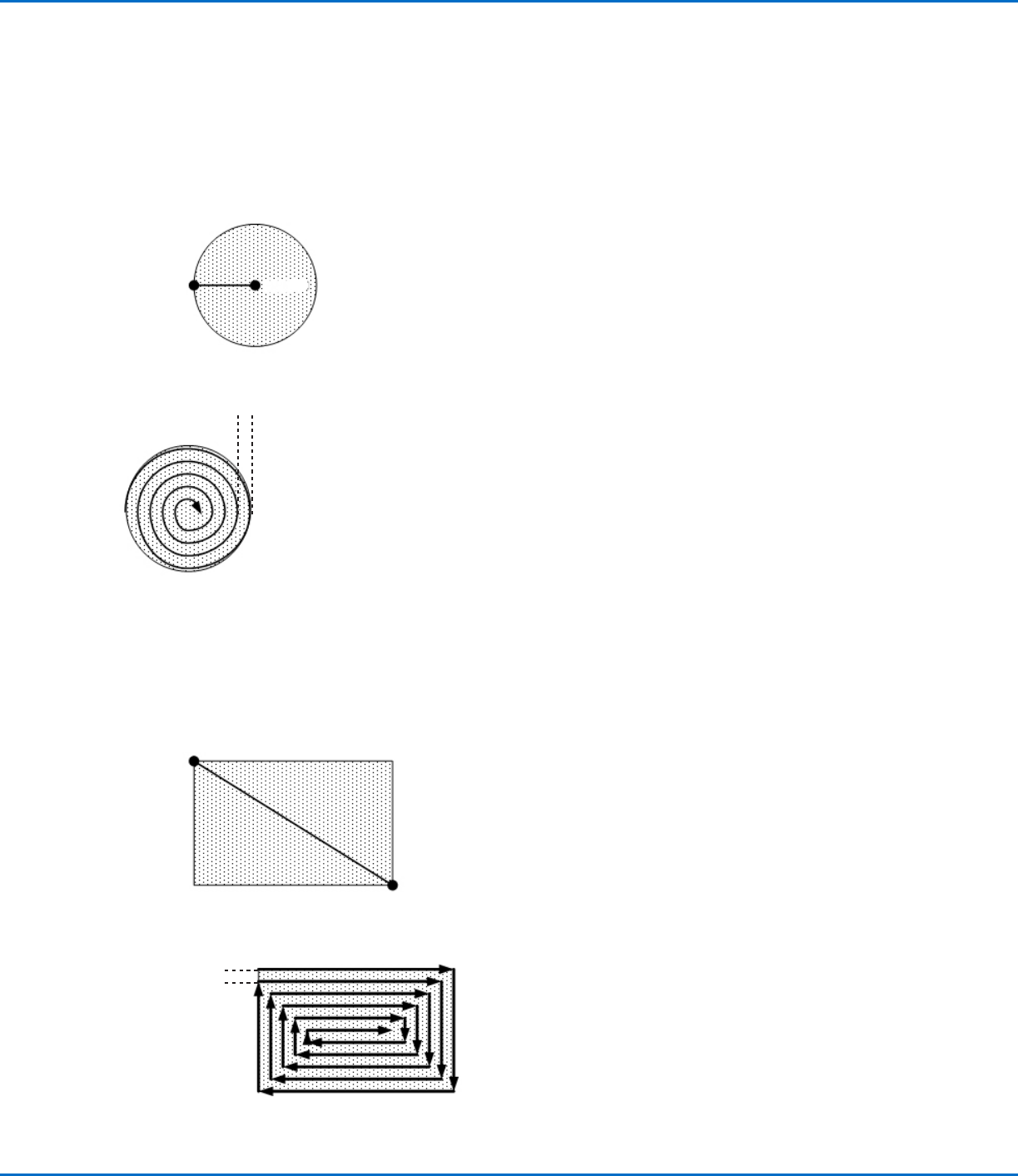 This command fills the defined area by moving the tip along a spiral path from the outside of the circle to the center. After entering