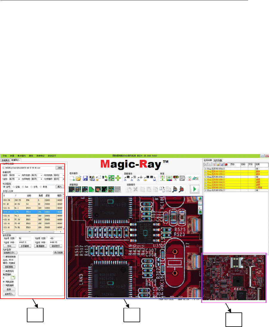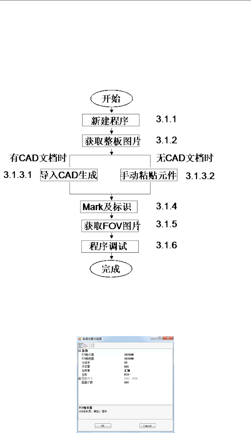 明锐炉后 AOI 操作手册 - 正式 72 2. 输入完 成后,点 “ OK ” ,完成新建 程序。 3.1.2 获取整板图片 点 “ 获取图像 ” 快捷图标 , 设备开始拍照 , 并对图像进 行拼接 。 当图像拼接 完成后 , 将在主 界面显示 PCB 整图。 3.1.3 生成程序 3.1.3. 1 导 入 CAD 生成程序 当有 CAD 时,可利用 CAD 文件生成程 序: 1. 点主界面左上角 的 “ 批量导入 ” 按扭,进入 到…