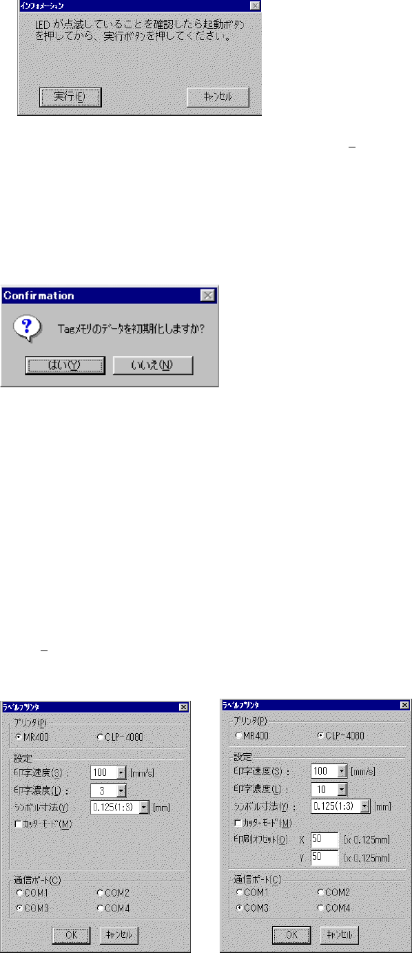 さらに、 メッセージの指示に従って操作を行い [実行 ( E) ] ボタンを 押します。 すると、 [インフォメーシ ョン] ダイアログボックスが閉 じ、 処理が完了します。 (4) Tag メモリのデータ初期化を行います。 [ Tag メモリ初期化 (T) ] ボタンを押すと、 確認のための [ Tag メモリ初 期化] ダイアログボックスが表示されます。 処理中の [インフォメーシ ョン] ダイアログボックスが表示され、 Tag メ…