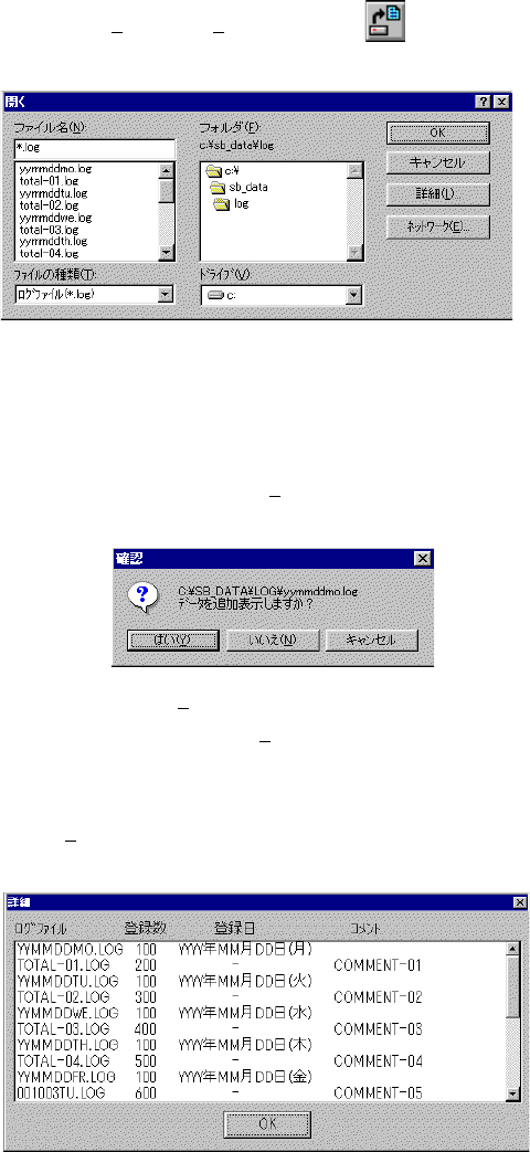 7.8 7.8 7.8 7.8 7.8 ログファイル処理 ログファイル処理 ログファイル処理 ログファイル処理 ログファイル処理 7.8. 1 7.8. 1 7.8. 1 7.8. 1 7.8. 1 ログファイルを開く ログファイルを開く ログファイルを開く ログファイルを開く ログファイルを開く ログファイルを画面に表示します。 また、 複数のファイルを一つの画面上に 表示できます。 操作手順 操作手順 操作手順 操作手順 操作手順 …