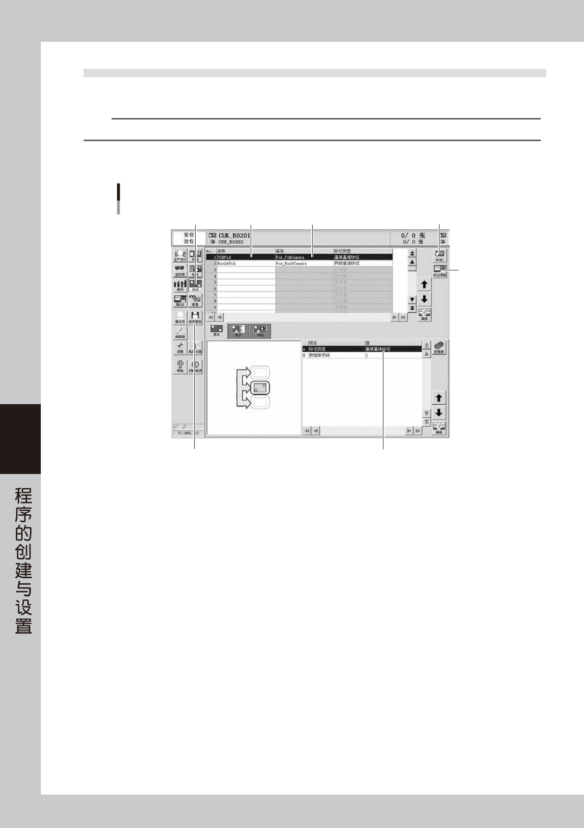 5-29 5 7. 标记数据的创建 本章节,介绍基板和网板基准标记用标记数据的创建方法。每个登录的标记数据都有如下图所示的各种参数, 没有直接设置的参数,则通过标记调整边确认边取得最佳值。 标记数据的参数构成 标记名 备注 (标记类型) 表面类型 识别类型 标记界限值 标记识别公差 标记检测范围XY 外圈照明级别 内圈照明级别 同轴照明级别 IR外圈照明级别 IR内圈照明级别 标记外部噪点消除数 标记内部噪点消除数 标记类型 …
