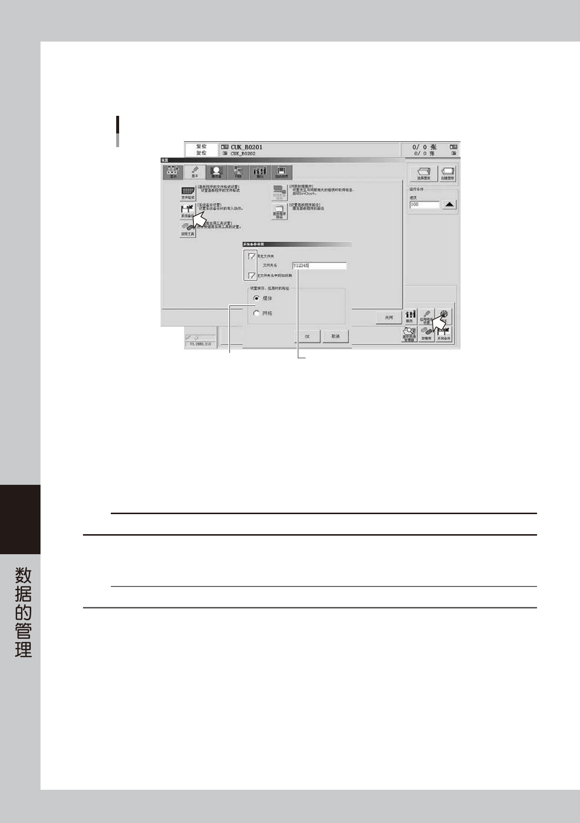 6-6 6 3 设置系统备份。 按 [ 生产设计 ] -“实用工具”选项卡画面的 [ 应用程序设置 ] 按钮,打开“设置”画面。按“基本”选项 卡的 [ 系统备份 ] 按钮。显示“系统备份设置”对话框。 系统备份的设置 输入文件夹名 指定备份位置 66605-N3-00 固定文件夹 ‧ 如果勾选此选择框,将以“文件夹名”输入框中所输入的名称为文件夹名自动创建文件夹,并在该文 件夹中备份系统数据。 ‧ 如果不勾选此选择框,在进行备份时,会…
