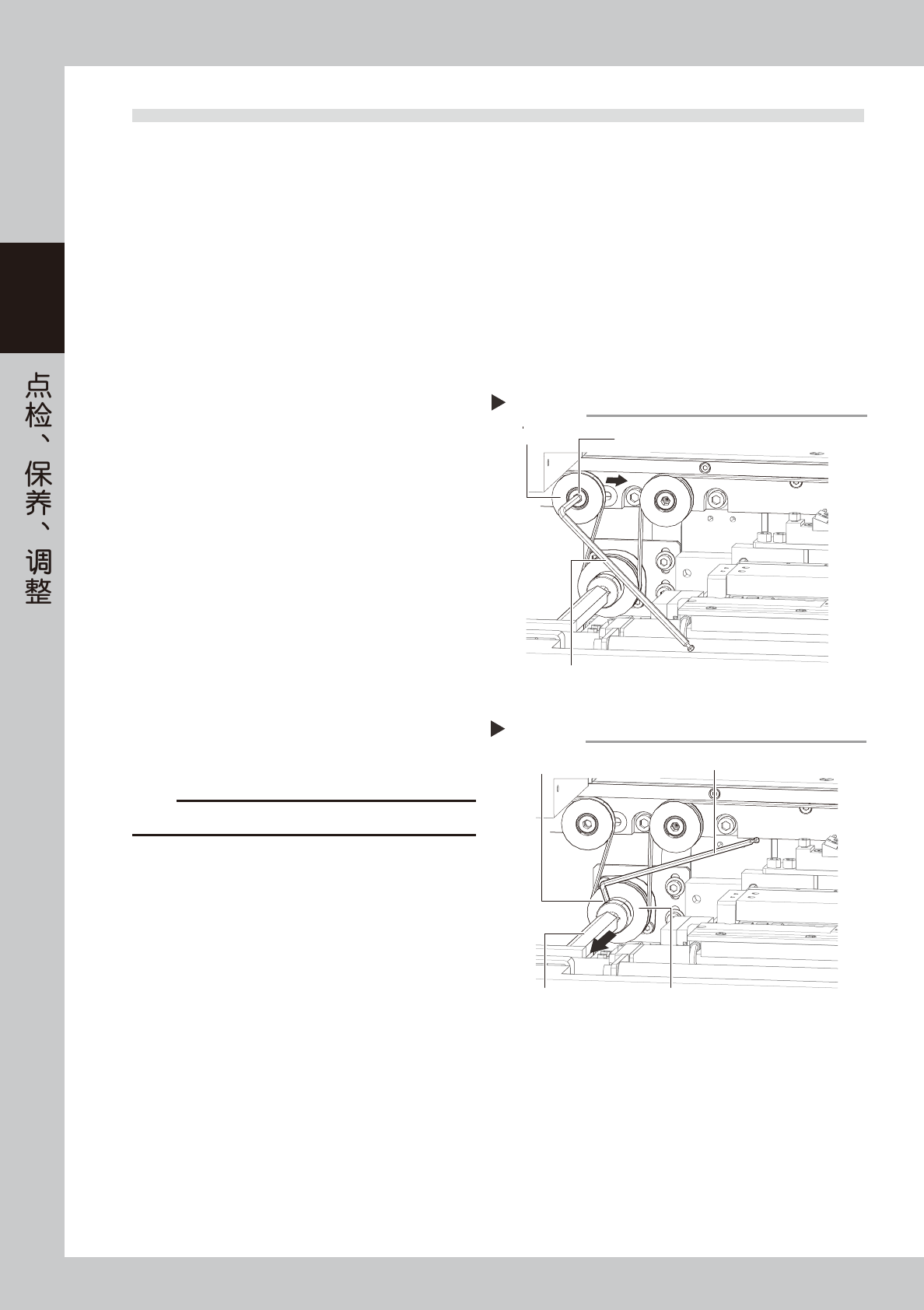 2-18 2 3.5 传送带的更换 下面,介绍传送带的更换方法。 ■需准备的用具 ‧ 六角扳手 (3mm、5mm) ‧ 细软刷 ‧ 无尘纸 ‧ 更换用传送带 (KKX-M9124-00XBELTCONVEYOR) e 1 按下紧急停机按钮。 为保障安全,务必按下紧急停机按钮。 2 放松传送带。 参照右图,用六角扳手 (5mm) 拧松张力调节螺栓之 后,将张紧轮移向长孔最边端 ( 松弛方向 )。 55213-N3-…