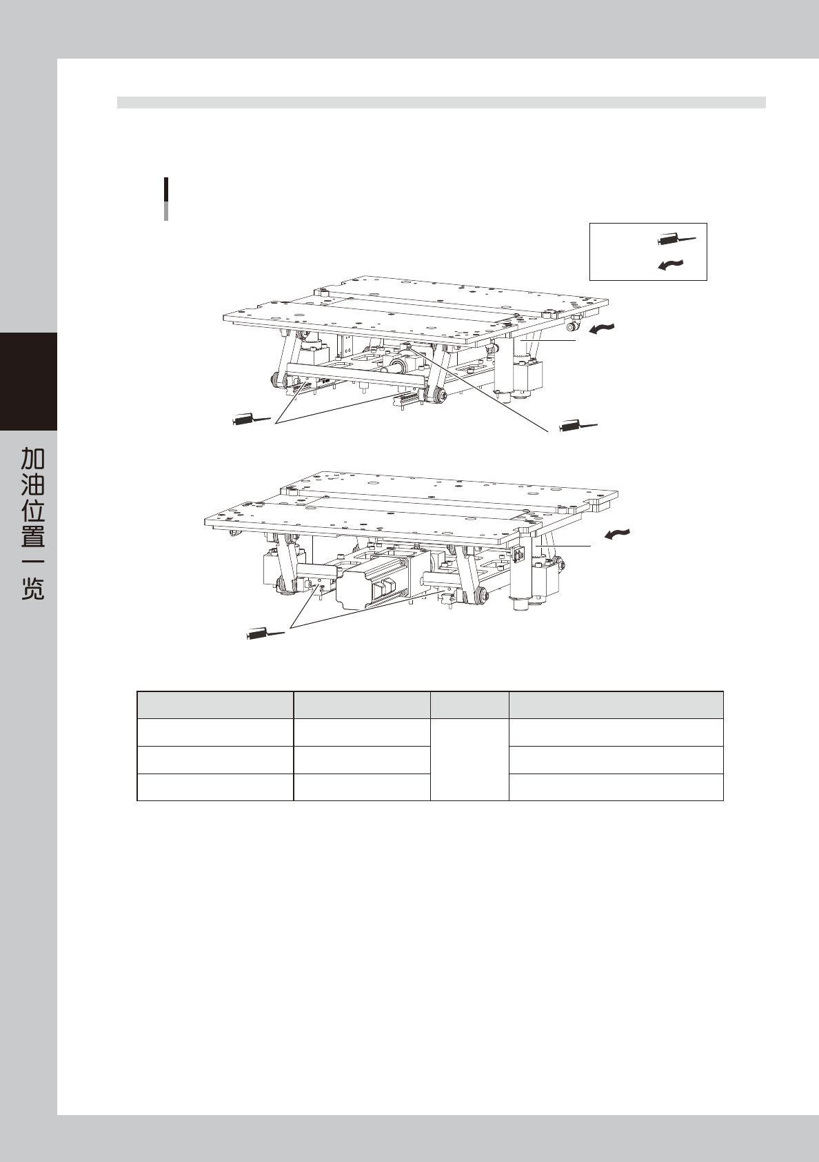 3-7 3 2.4.2 W1 轴、W2 轴 ( 自动调节传送宽度 ) W轴的加油位置 各工作台 润滑油枪 : 用手涂抹 : 传送轨部 直线导轨 6角轴 W轴滚珠丝杆 W轴滚珠丝杆 W轴导轨部 润滑油注油嘴 W轴导轨部 润滑油注油嘴 55308-N3-00 加油部位 加油位置 频率 加油方法 W 轴导轨 4 ( 各工作台 ) 每月 润滑油枪 W 轴滚珠丝杆 2 ( 各工作台 ) 用手涂抹 W 轴 6 角轴 1 ( 各工作台 ) 用手涂抹…