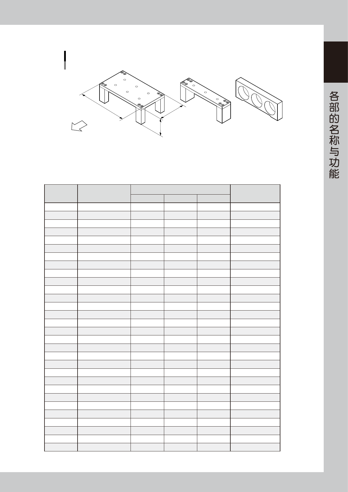 如下表所示,不同尺寸的基板可在 W 方向排列 A 〜 C 平面支撑夹具的个数不同,同时使用顶针时,可使用的顶针