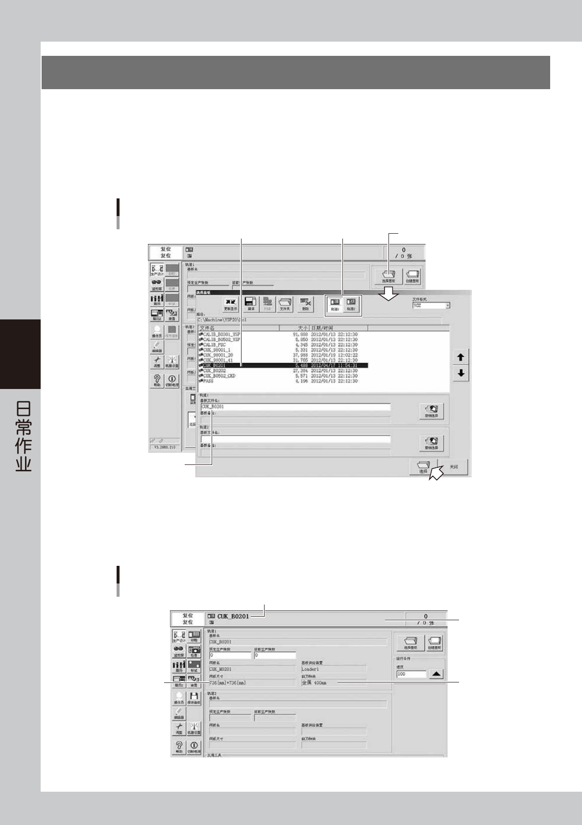 2. 按轨道切换按钮,选择想要进行生产的轨道,选择想要生产的基板程序名后,按 [ 选择 ] 按钮。