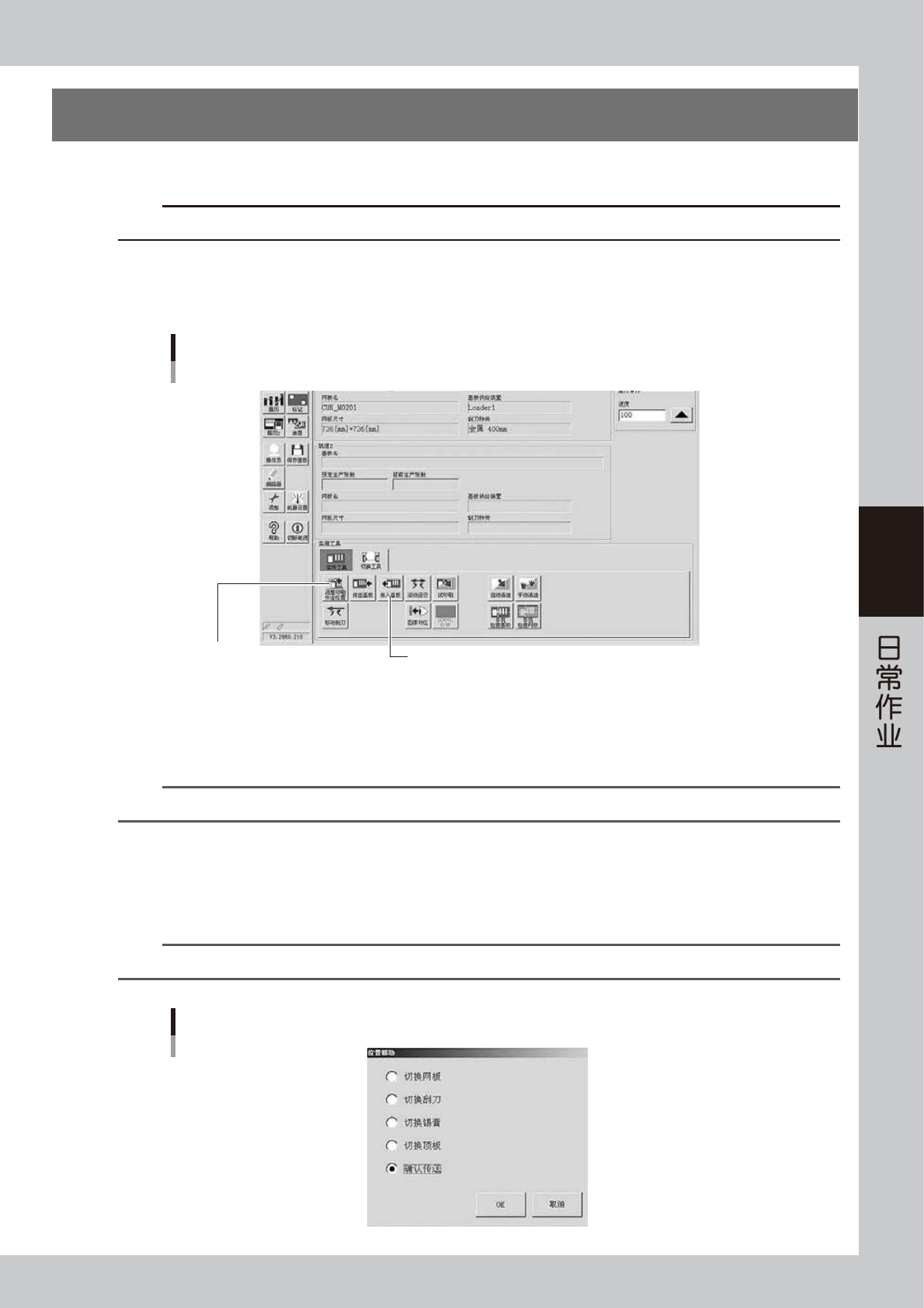 如果想要生产与前次不同的基板时,必须调节传送装置 ( 如果生产与前次相同的基板时,可省略此步骤 )。