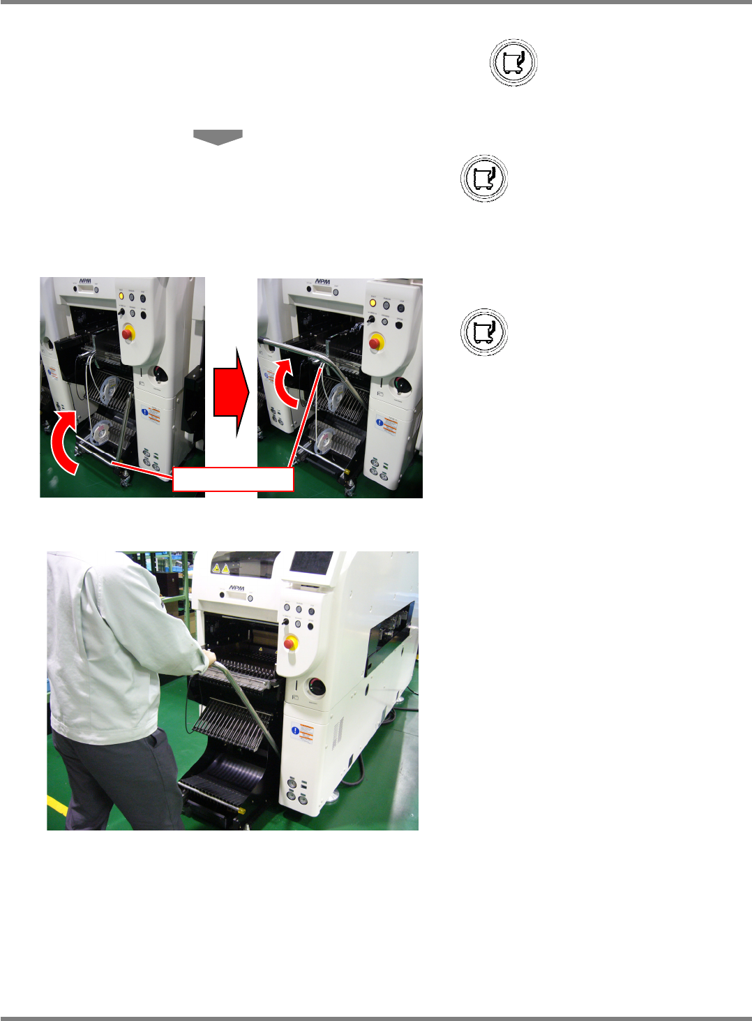 NPM-D 维修篇 2.2 交换台车 ( 选购件 ) 的拆卸和安装 Page 2-6 EJM1DC-MB-02M-00 2.2 交换台车 ( 选购件 ) 的拆卸和安装 要求 • 该维护作业,应在主电源开关以及伺服开关处于 ON 的状态下进行。 • 进行交换台车 ( 选购件 ) 的安装、 卸下以及搬送作业时, 有可能因碰撞而导致交换台 车及供料器的破损,因此请边确认前后左右的位置边进行作业。 拆卸步骤 1 按操作面板的 。 • 将会显…