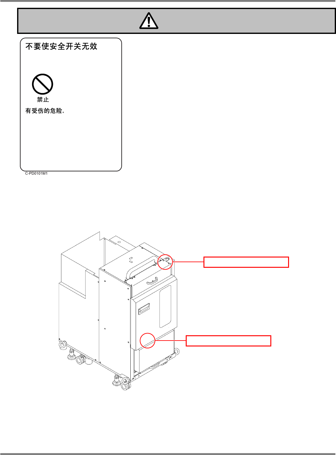 NPM-D 安全注意事项 EJM1DC-SF-01N-00 Page S-3 z 关于安全开关的位置 托盘供料器 ( 选购件 ) 的料箱门和补给部之 2 处设有安全开关。 危险 N610074920AA 料箱门的安全开关 补给部的开闭开关