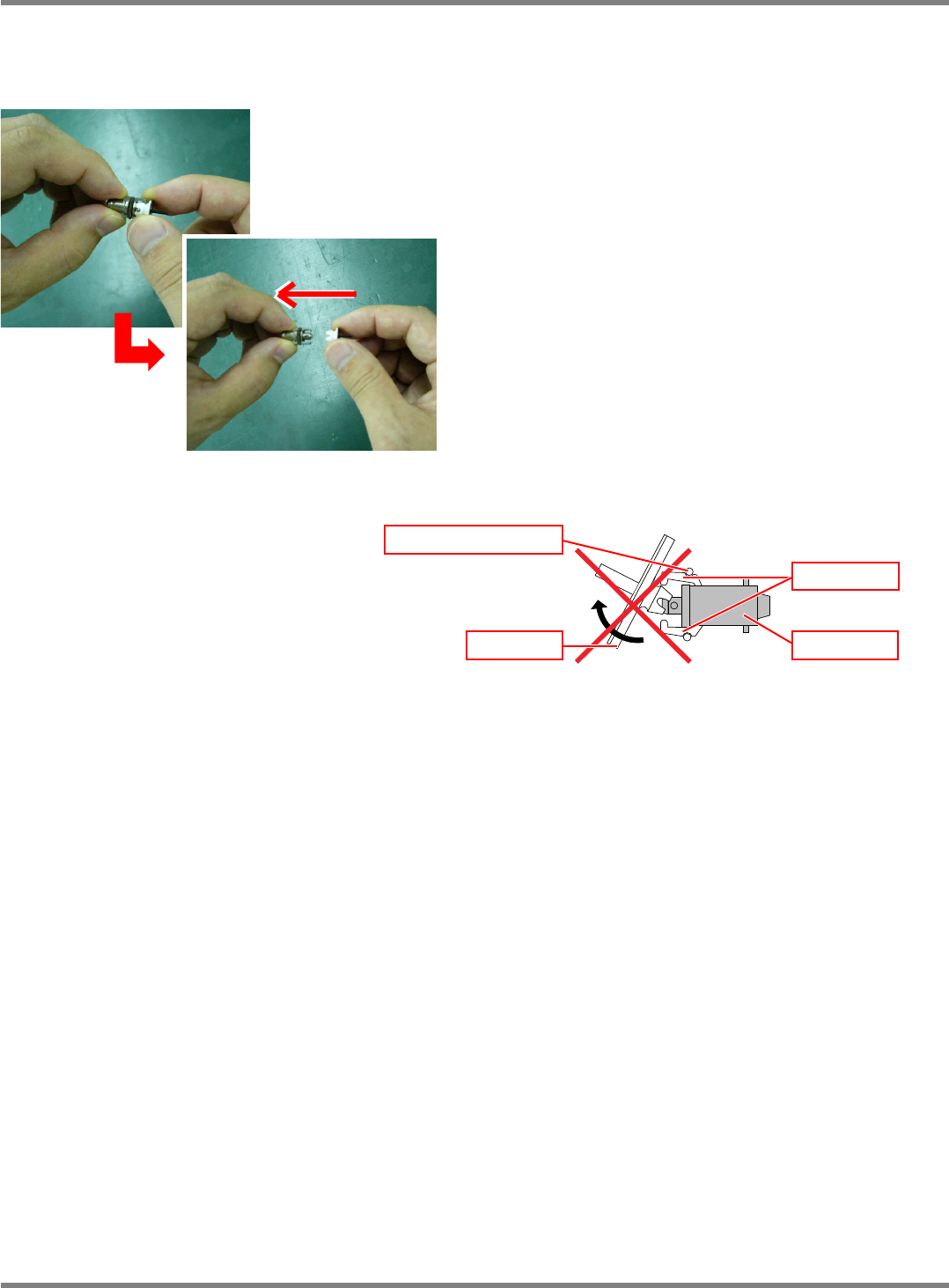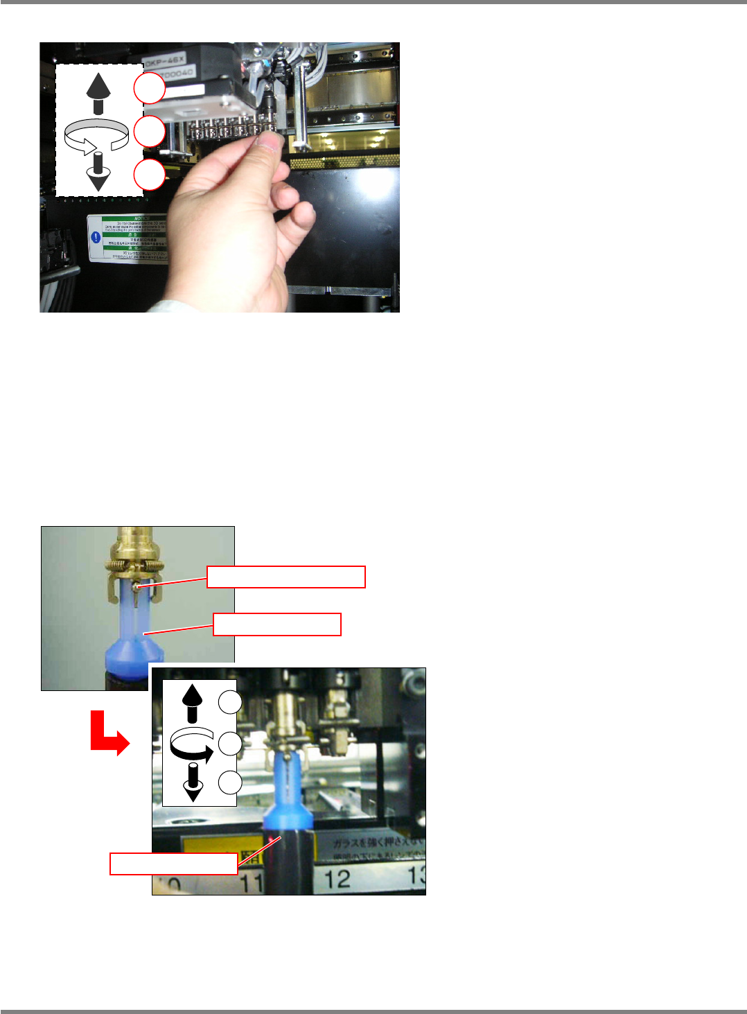 NPM-D 维修篇 4.2 吸嘴座的清扫 Page 4-8 EJM1DC-MB-04M-00 B) 从吸嘴座上拆卸吸嘴 ( 吸嘴座和吸嘴同时拆下时 ) 1 先将吸嘴座和吸嘴分离。 ∗ 请握住吸嘴反射板的边缘,如左图所 示把吸嘴 座水平拔出。 ∗ 如下图所示,拔出方法不正确时会造 成夹具爪 脱落。 < 拆卸吸嘴的不良方法 > 444C-406E 夹具爪 吸嘴 夹具爪压紧弹簧 吸嘴座