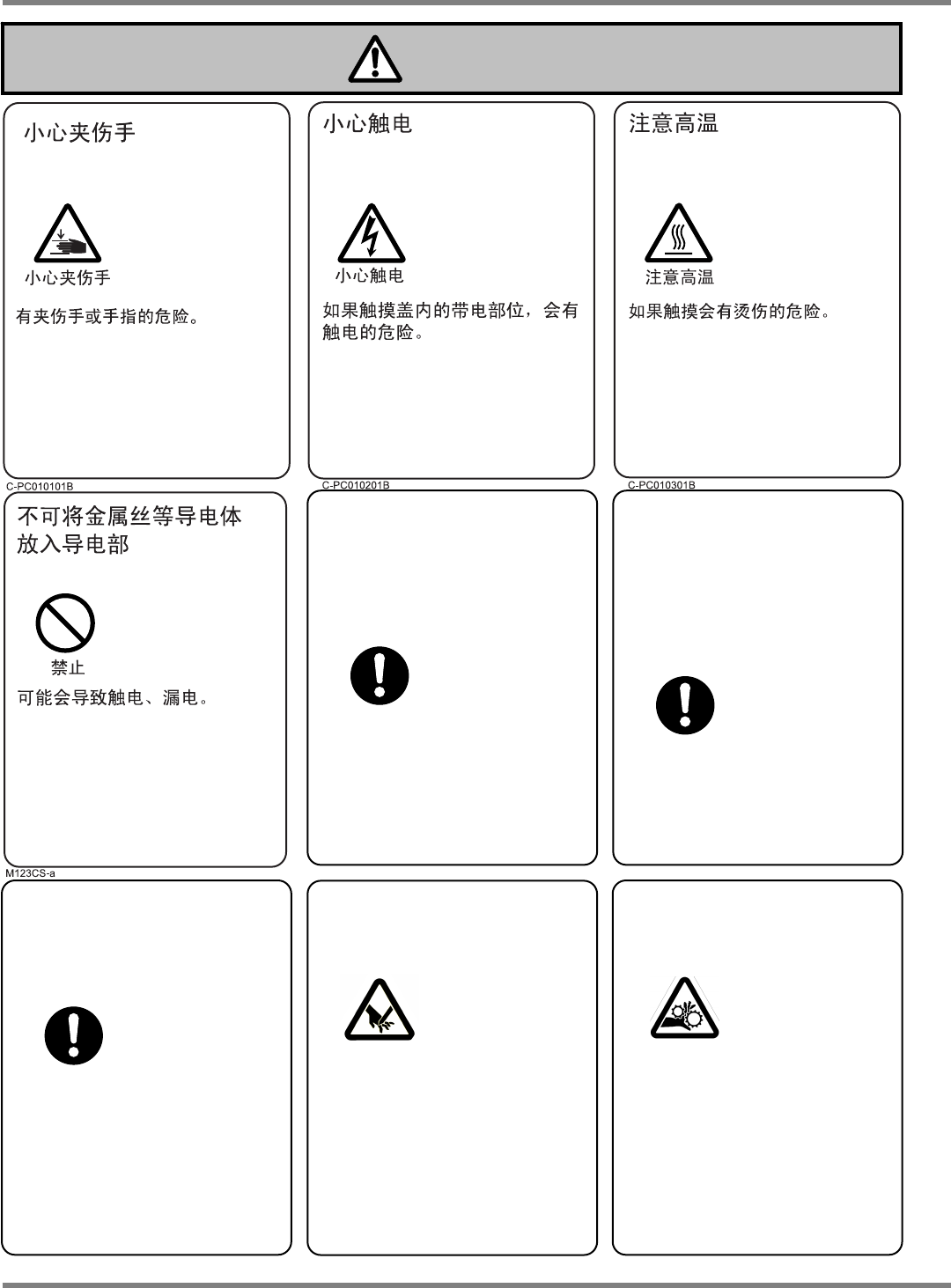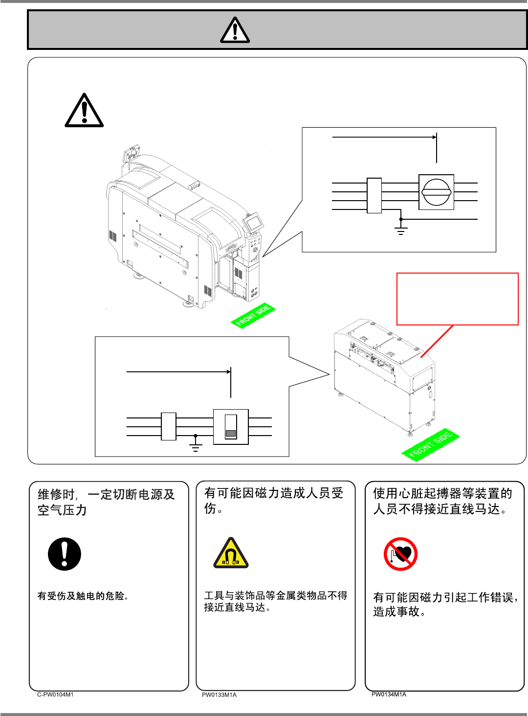 NPM-D 安全注意事项 Page S-10 EJM1DC-SF-01N-00 警告 将手伸入可动部进行调整 作业时,先将伺服开关置 于 OFF , 并将画面切换功 能置于锁定状态后进行。 机器会运转,有受伤的危险。 M67CSxx 在变更生产基板时如果在 可动部内进行作业,先将 伺服开关置于 OFF ,并 将 画面切换功能置于锁定状 态后进行。 机器会运转,有受伤的危险。 M97C Sxx 有切伤手或手指的危险 不要触摸刀具部。 M9…