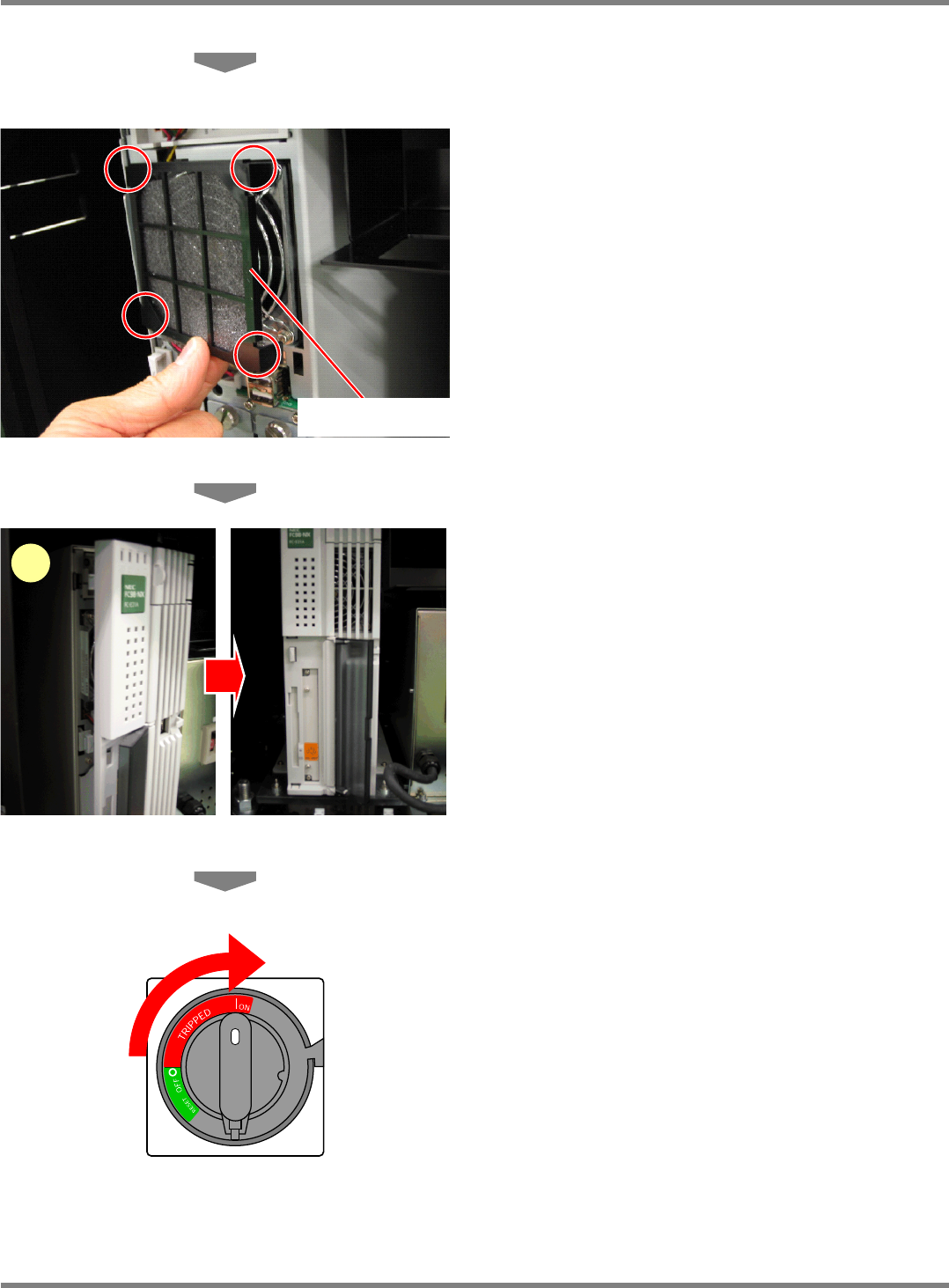 NPM-D 维修篇 6.3 检查 BOX: FA 电脑 空气过滤器的清扫 Page 6-8 EJM1DC-MB-06M-00 10 清扫过滤器。 ∗ 用吸尘器等清除灰尘。 11 安装过滤器。 ∗ 将过滤器安装到过滤器压盖上,将挂 钩插入 4 处风扇安装槽,安装过滤器压盖。 12 安装 FA 电脑的盖。 ∗ 将盖右侧的 3 处钩子对准齐机箱的凹槽,然后 对准左侧的 3 处,最后推入盖整体。 13 安装检查 BOX 的前面盖。 ∗ 使用六角…