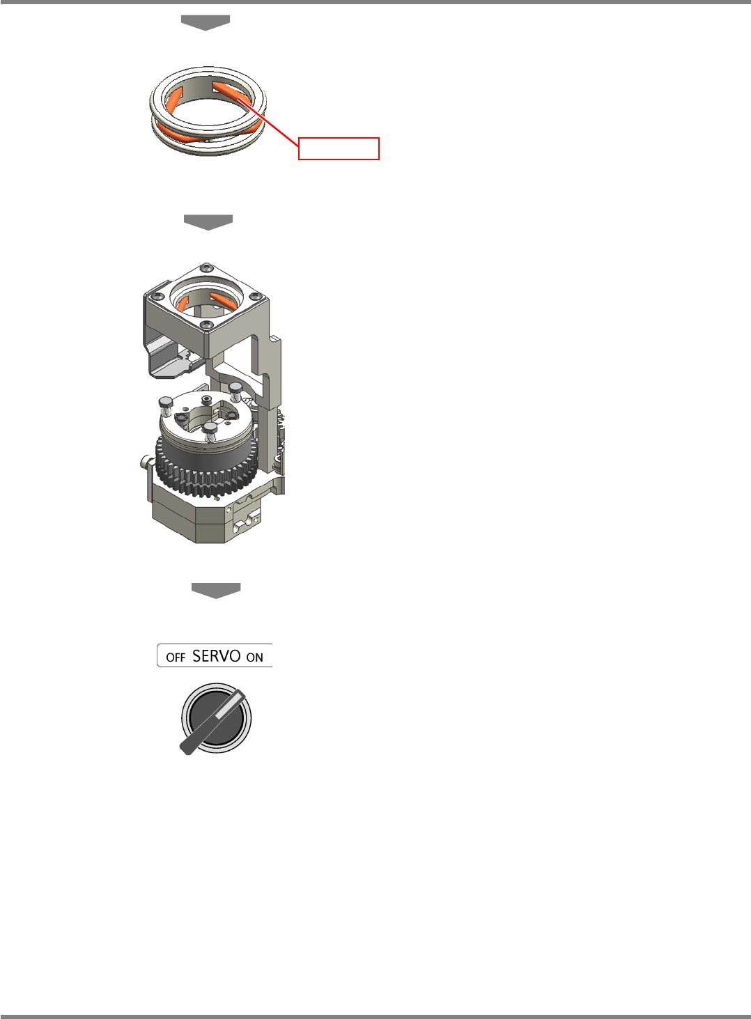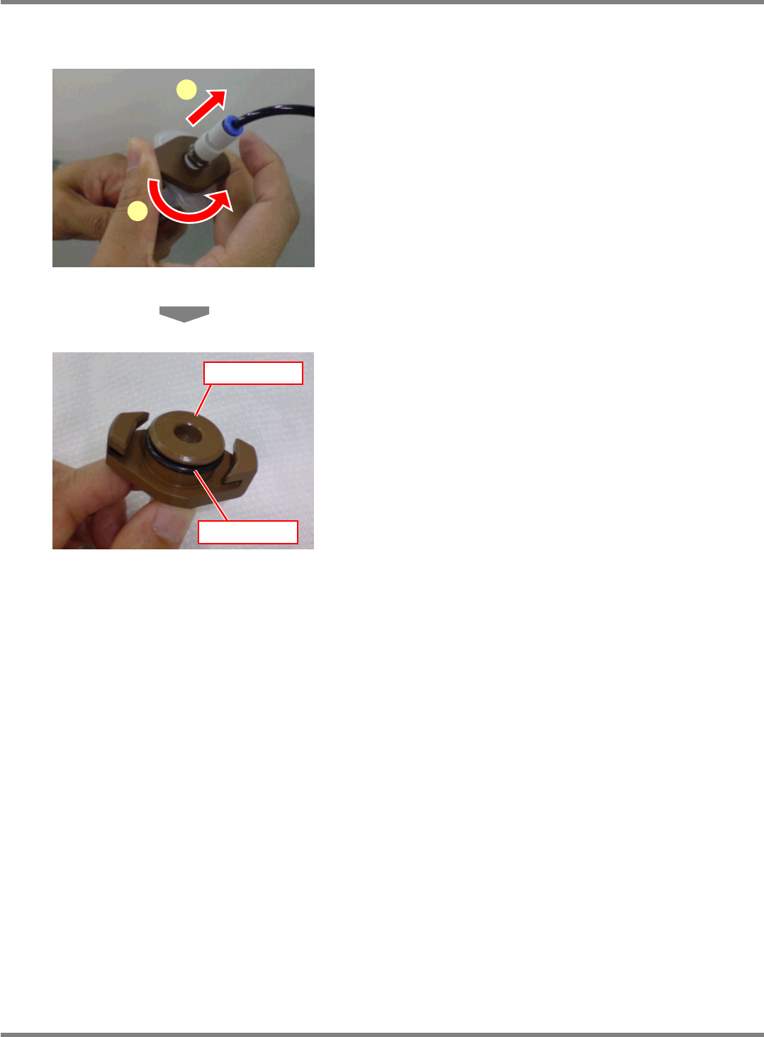 NPM-D 维修篇 6.4 O 型环 ( 点胶头 ) 的更换 ( 选购件 ) Page 6-12 EJM1DC-MB-06M-00 接头部 1 从接头部取下注射器。 ∗ 拧松接头 (1) 后,抽出 (2) 。 2 取下 O 型环。 3 擦干净粘合剂。 ∗ 如果在 O 型环的贴装部周围有粘合剂等 附着, 请用绵丝蘸上溶剂 ( 酒精等 ) 后擦拭干净。 ∗ 粘合剂的附着,会导致空气泄露而造 成点胶不 良。 4 安装上新的 O 型环。 2…