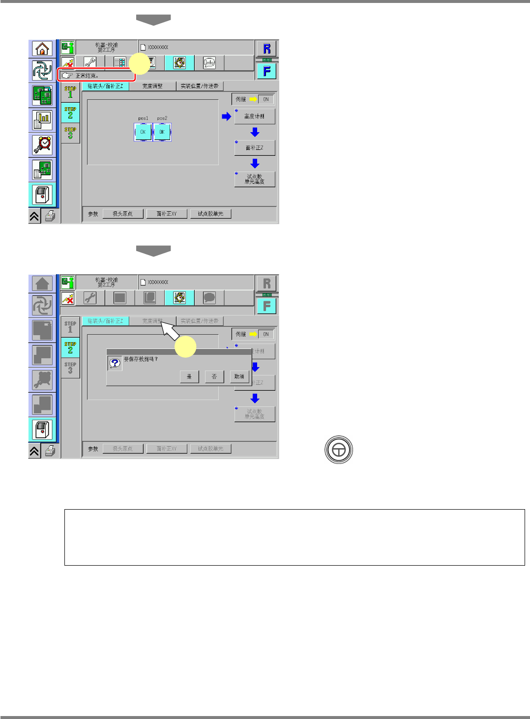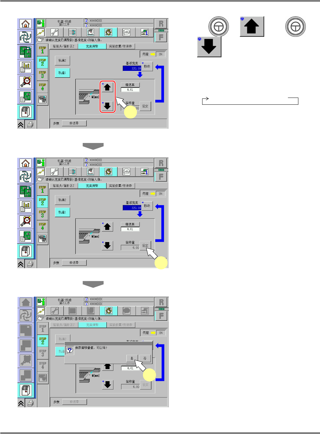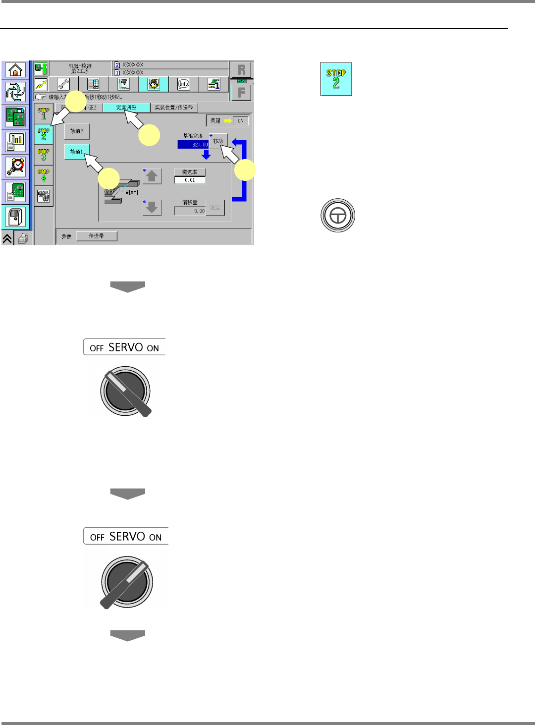 NPM-D 维修篇 9.5 宽度调整 Page 9-22 EJM1DC-MB-09M-00 9.5 宽度调整 1 按 。 2 按 [ 宽度调整 ] 。 3 按 [ 轨道 1] 。 4 按 + [ 移动 ] 。 ∗ 基准宽度为 320 mm 。 5 卸下交换台车。 6 将伺服开关置于 OFF 。 7 打开安全盖。 8 卸下供料器工作台盖。 9 使用游标尺测量传送带宽度。 10 安装供料器工作台盖。 11 关闭安全盖。 12 将伺服开关置于…