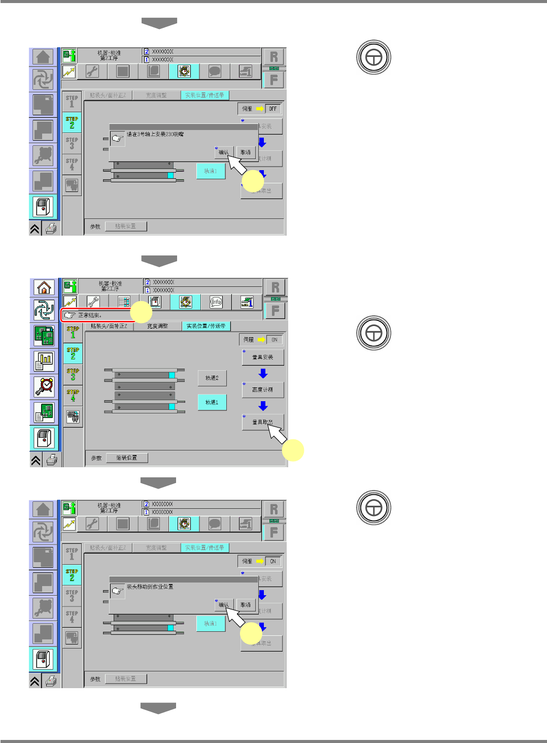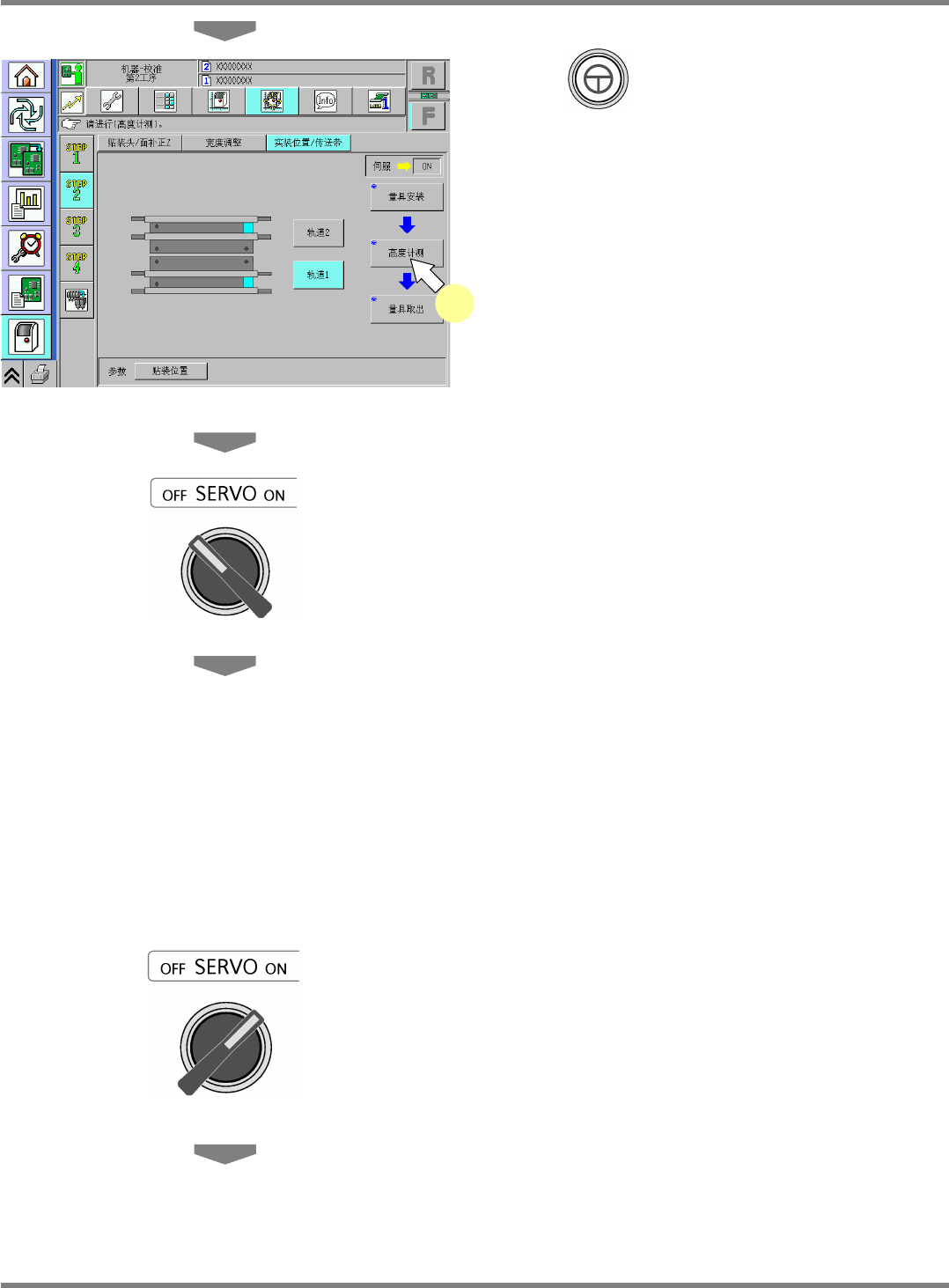 NPM-D 维修篇 9.6 实装位置 / 传送带 Page 9-26 EJM1DC-MB-09M-00 10 按 + [ 高度计测 ] 。 • 吸头将会移动到作业位置。 11 将伺服开关置于 OFF 。 12 打开安全盖。 13 安装吸嘴。 16 吸嘴吸头 ∗ 请将 230CS 吸嘴安装在吸嘴位置 5 上。 12 吸嘴吸头 ∗ 请将 230CS 吸嘴安装在吸嘴位置 4 上。 8 吸嘴吸头 ∗ 请将 230C 吸嘴安装在吸嘴位置 3 上。…