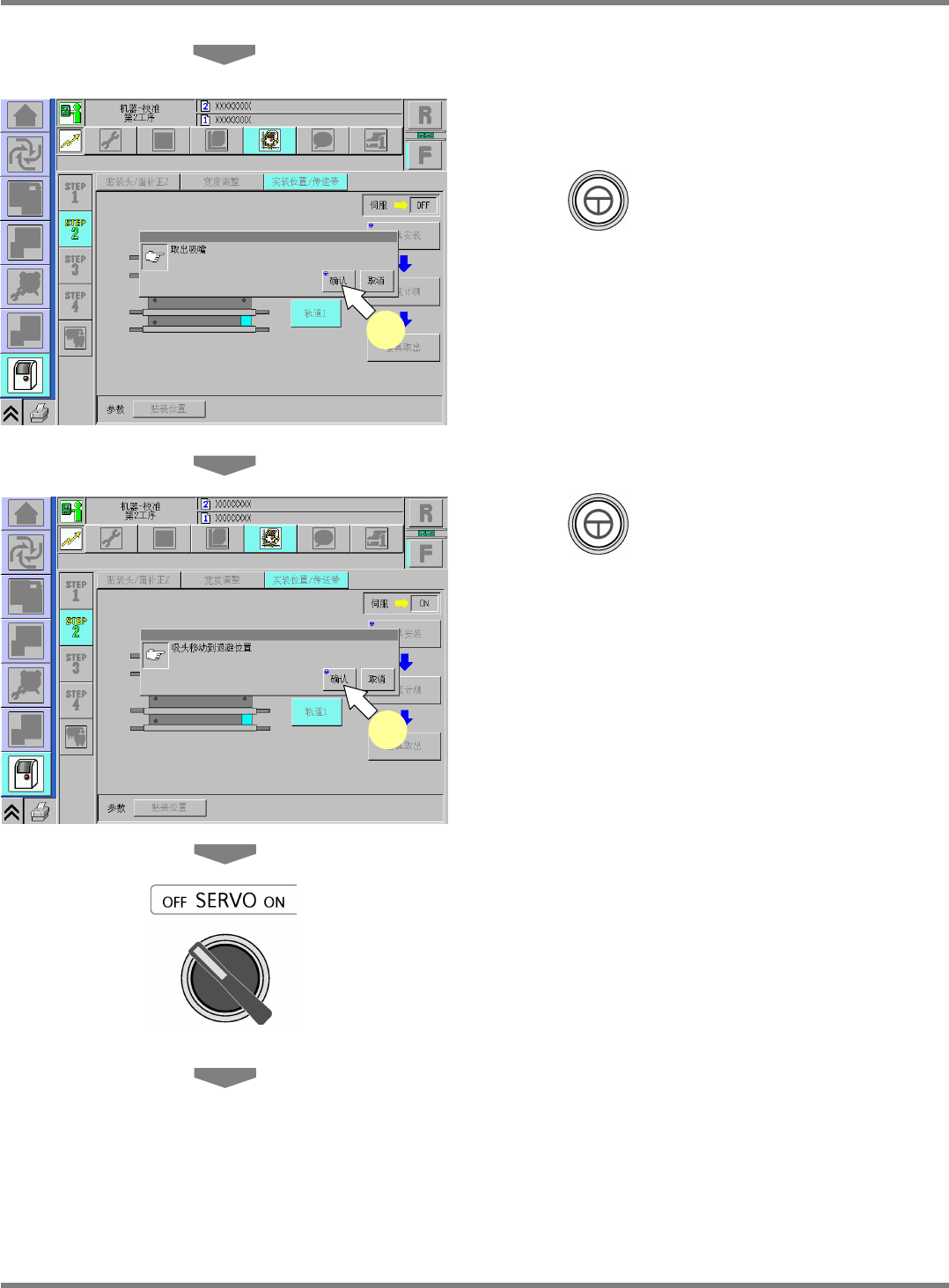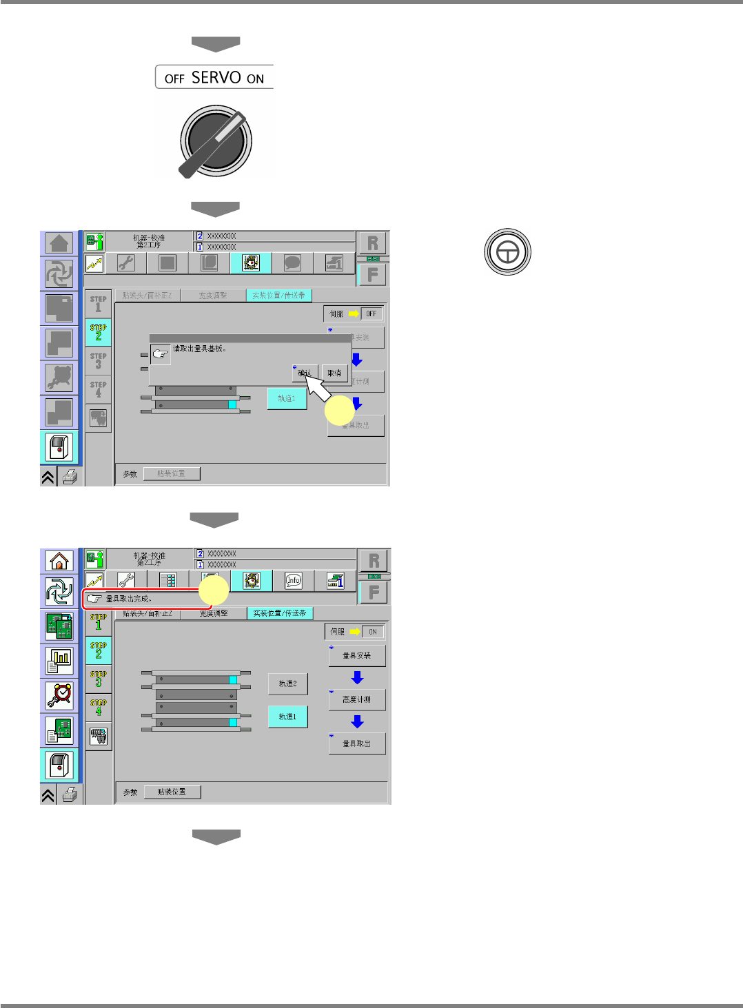 NPM-D 维修篇 9.6 实装位置 / 传送带 EJM1DC-MB-09M -00 Page 9-29 30 关闭安全盖。 31 将伺服开关置于 ON 。 32 按 + [ 确认 ] 。 • 宽度调整轴会移动到原点,支撑块会 上升。 33 确认是否已正常结束。 DualUnitCalibCon veyorPCBPos-10C50 32 DualUnitCalibCon veyorPCBPos-12C50 33