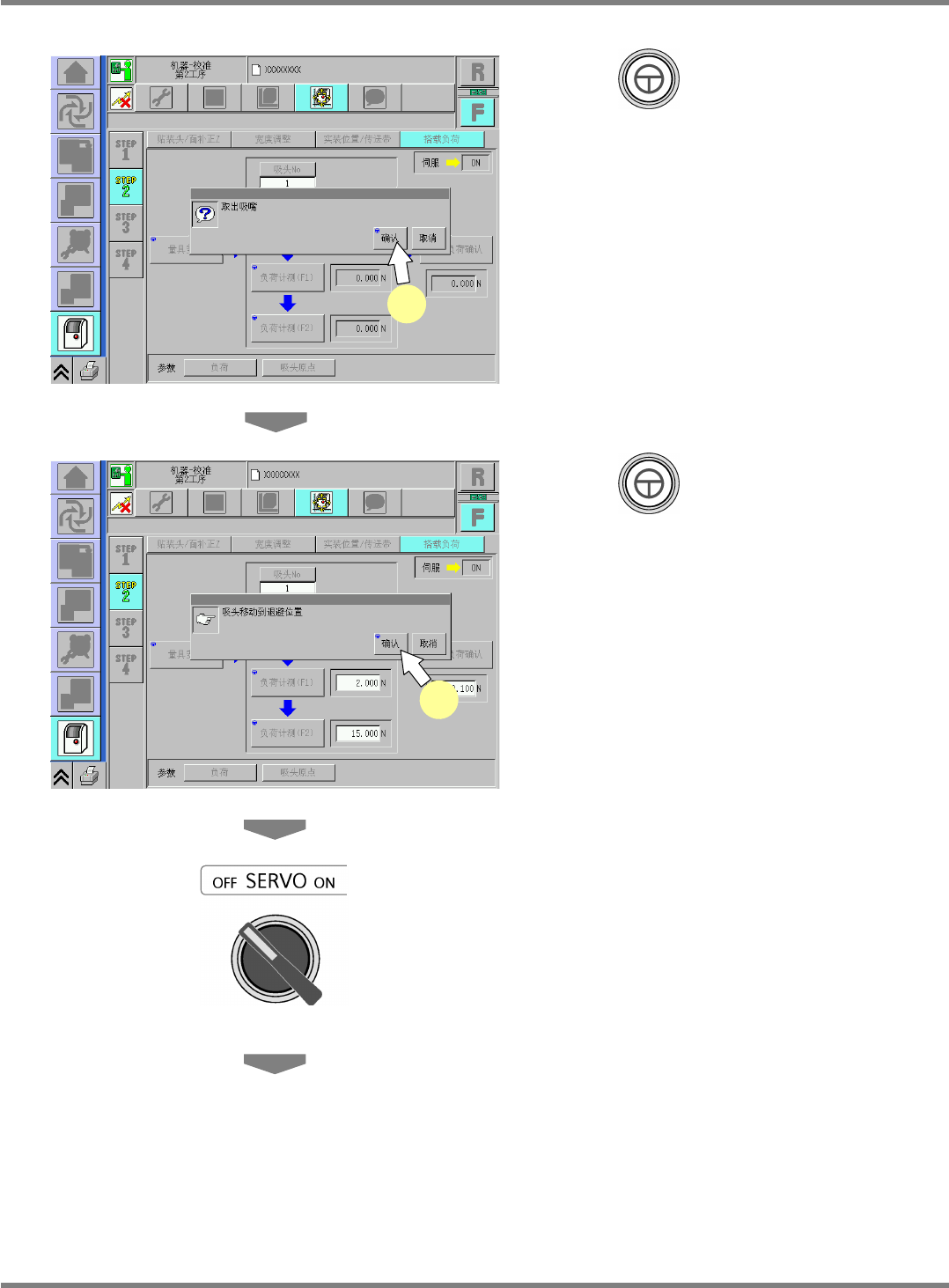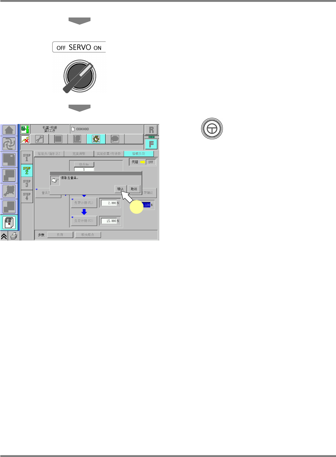 NPM-D 维修篇 9.8 搭载负荷 Page 9-50 EJM1DC-MB-09M-00 47 关闭安全盖。 48 将伺服开关置于 ON 。 49 按 + [ 确认 ] 。 • 吸头移动到原点位置后, 将会切换到在程序 35. 中所选择的画面。 UnitCalibHead Load-22C03 49