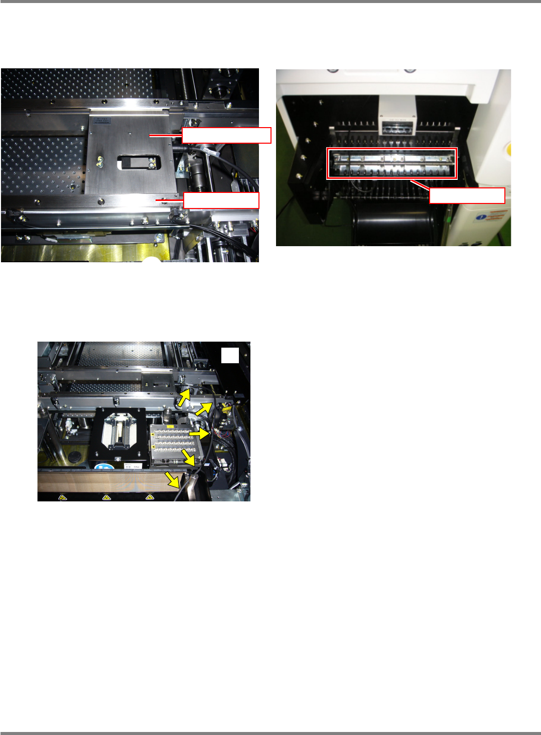 NPM-D 维修篇 9.8 搭载负荷 Page 9-52 EJM1DC-MB-09M-00 安装时,请将搭载负荷测量量具的右 端面对准传送带的基板夹具 的右端面,并将电源线连接 到交换台车的 任意的电源供给部上。 安装量具时,根据基板流向、前、后 的设定基准,将量具推靠在 轨道的基准侧。在左右方向 ,请将量具的 端面对准传送带基板夹具的端面进行 安装。此外,请参考照片 c 进行配线,注意不要使配线干涉 到吸头。 c 轨道 ( 基准侧 )…