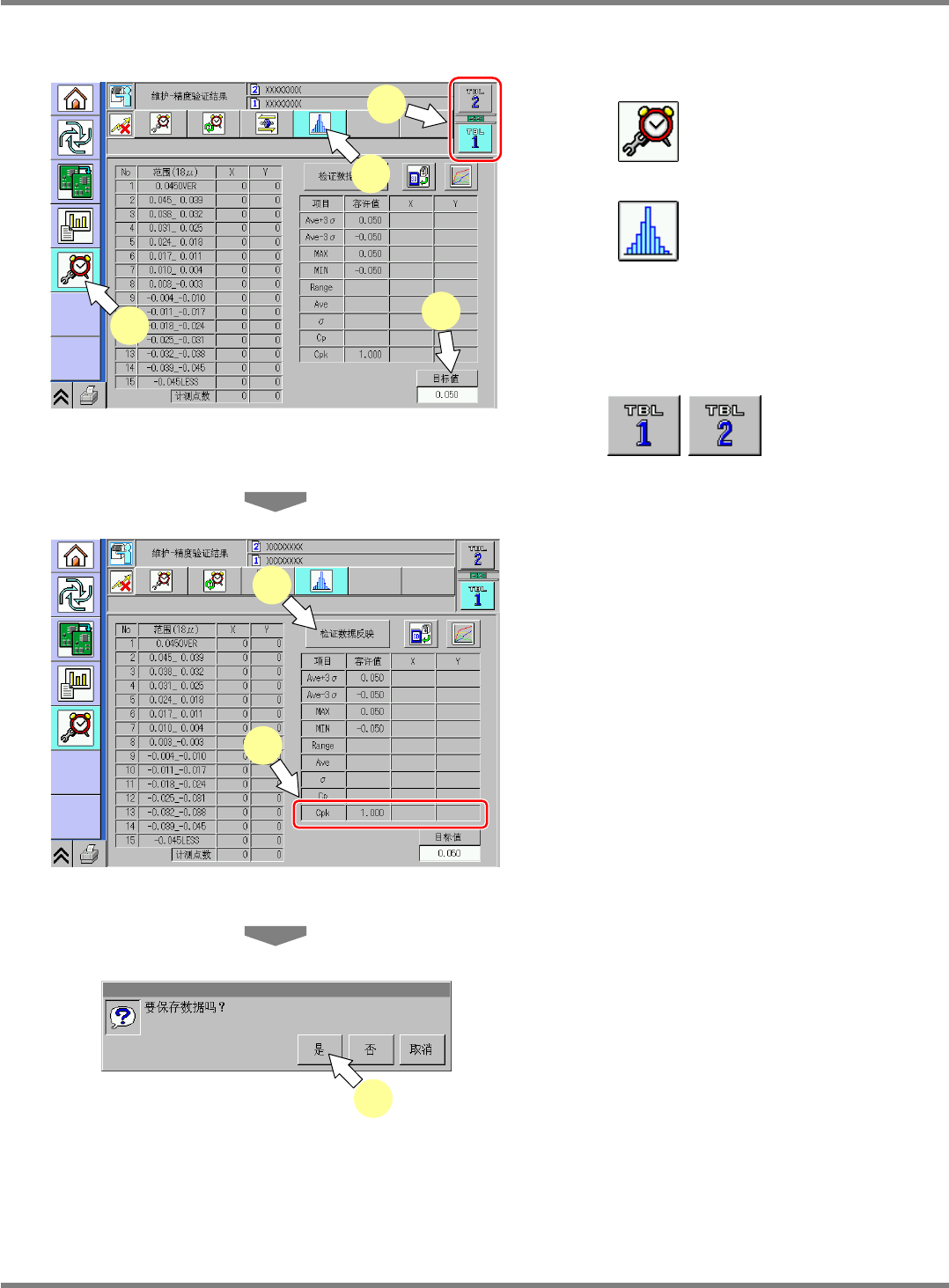 NPM-D 维修篇 9.20 检查头精度验证 EJM1DC-MB-09M -00 Page 9-125 ④ 计测结果的确认及反映 5 按 。 6 按 。 7 选择工作台。 ∗ 选择检查头的工作台。 • 按 ,显示前后个别和综合 的精度。 8 按 [ 目标值 ] 。 ∗ 9 µ m 0.020 mm ∗ 18 µ m 0.040 mm 9 确认结果。 ∗ 计测结果的 Cpk 比规定值低时,将验证数据反 映到检查照相机偏移量中。 10 反映…