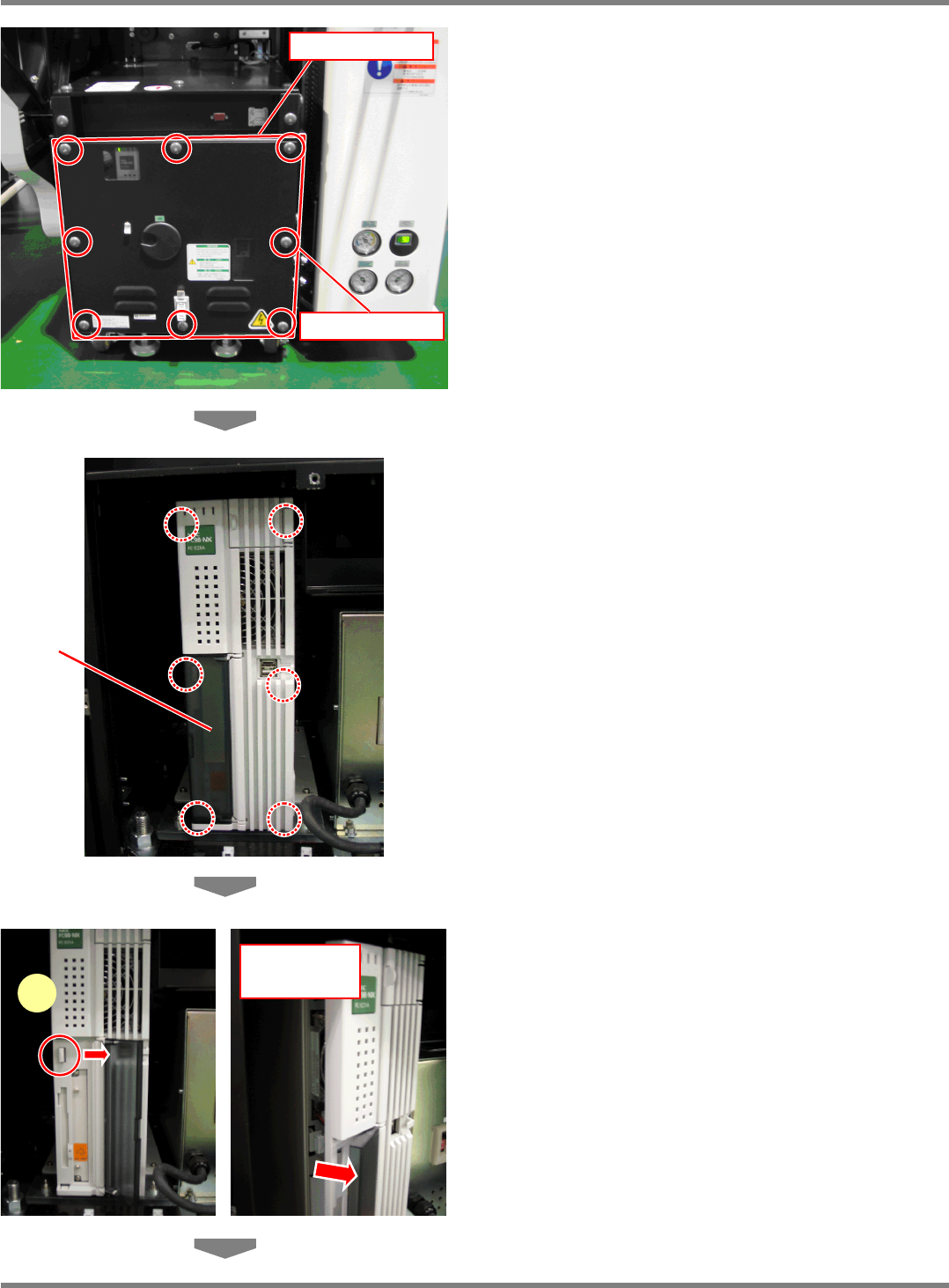 NPM-D 维修篇 11.3 蓄电池的更换 EJM1DC-MB-11M -00 Page 11-25 9 拆下 UPS 蓄电池的盖。 ∗ 拆下固定盖的螺钉 (2 处 照片中实线圆圈部 分 ) 。 10 拆下 UPS 蓄电池。 ∗ 拆下固定蓄电池的螺钉 (2 处 照片中实线圆圈 部分 ) 。 11 拉出 UPS 蓄电池。 ∗ 将蓄电池从主体内部拉出约 30 mm 。 ∗ 有损伤内部电缆的可能性,请注意不 要拉出过 多。另外,请注意不要夹住…