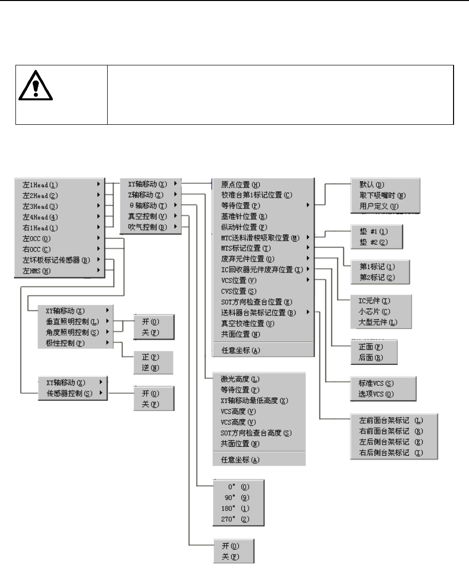 第 2 部 功能详细编 第 9 章 手动控制 9-3 贴片头控制菜单 右击轨迹球或按命令按钮的“贴片头控制菜单”,则显示 弹出菜单。从菜单的列表中选择要 执行的项目后,即执行该动作。 如果从弹出菜单中选择项目,则 轴将移动。在选择前, 请务必确认装置内 部无人作业。此外,为了避免人 身伤害,在运行过程中 ,切勿将手放入装 置内部,也不要将脸和头靠近装置。 警告 在MS参数的“选项”设定中未被选中(未安装)的单元,不显示相对应的菜单。 此…