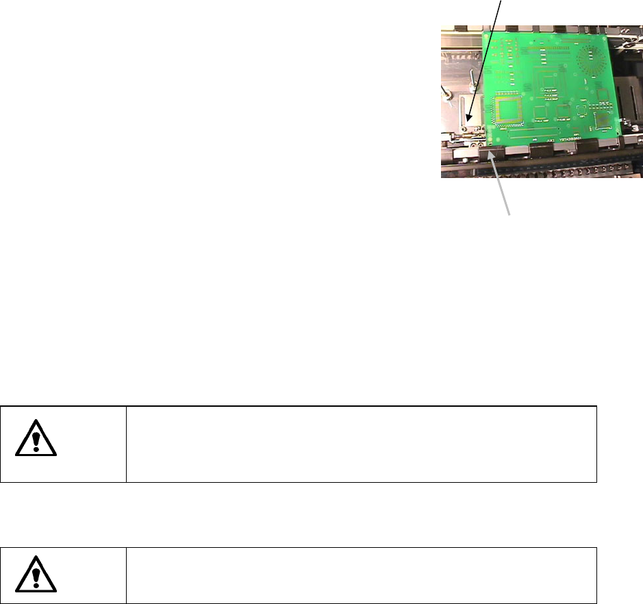 第1部 基本篇 第2章 生产 5. 将生产基板顶在停止挡销⑨上。 基板与停止挡销接触的部分因有缺口等而不稳定时, 请松动停止挡销底部的螺丝(2根), 用 手在Y方向上进行移动调整。 6. 旋转调节手柄 ⑱ ,将定心销(从动侧)导块一直移动到基板的外侧。 7. 使“夹杆 X”、 “夹杆 Y”进入“ON”状态。 按下“夹杆 X”按钮后,接着按“ON/OFF” 。 再按“夹杆 Y”钮,接着按“ON/OFF” 。 8 .把夹杆 X 移动到基版的…