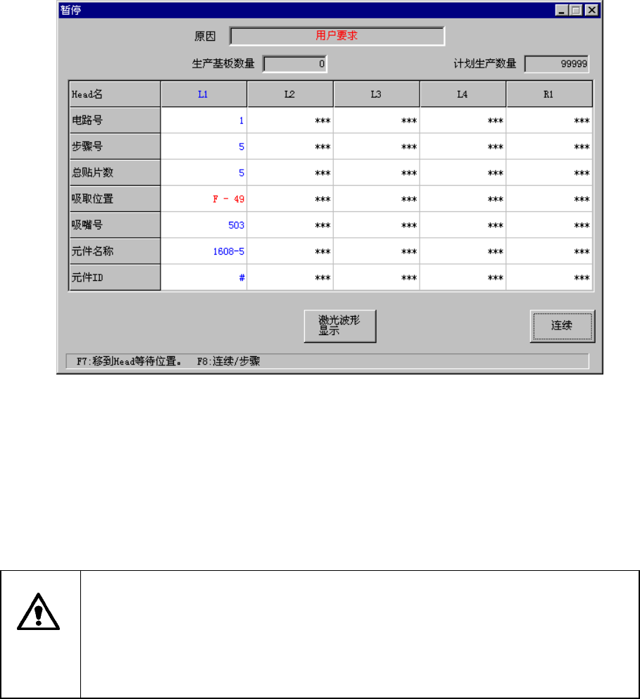 2) 当在步骤生产中停止时,或在连续生产中处于暂停时,按下键盘的“F7”键,可将