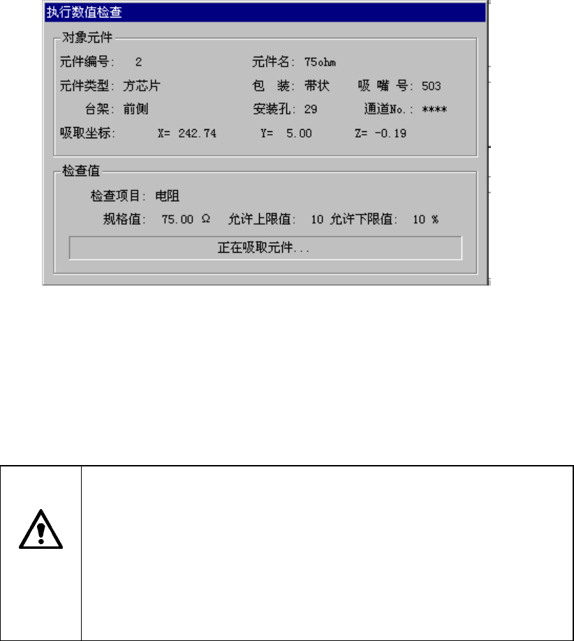 第 1 部 基本编 第 2 章 生产 ③ 验证检查结果 显示当前选中元件的检查项目、规格值、上限、下限。 元件检查后,在实测值中显示检查结果。 按下“执行数值检查”按钮执行单独检查,显示如下的画面。 图 2.10.6.1.4 正在进行单独检查 · 对象元件(检查中的元件) 显示检查中的元件内容。 · 检查值(检查中的值) 显示检查项目、规格值、允许值的上限下限与当前的动作状态。 注意 按下“ 单独检查” ,贴片头立即移动,开始生产。…