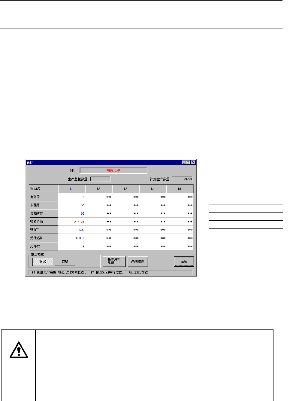 第1 部 基 本 篇 第2 章 生 产 3) 重新生产模式 重新开始生产动作的方法有“重试”和“跳过”两种。 表 2.11.1.1 重新开始生产动作时的模式动作 重新开始模式 重新开始生产动作的动作 重试 检索所有元件用尽的元件的替代送料器,如果所有送料器的元件都已用尽, 则在补满所有的送料器后,从该吸取贴片循环开始,重新开始生产。 跳过 跳过已用尽的元件,从下一个吸取循环重新开始生产。 4) 操作选项的动作 操作选项的选择项目 元件用…