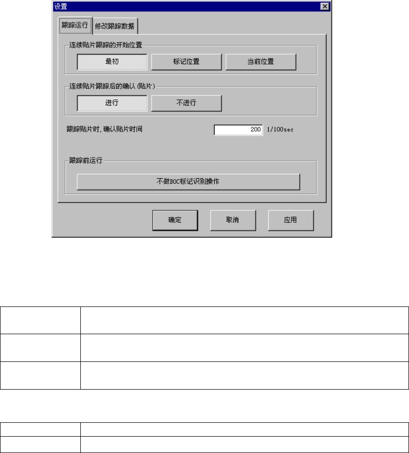 第1 部 基 本 篇 第2 章 生 产 ① 跟踪动作 当进行连续跟踪时,设定跟踪动作。 图 2.12.2.2.6 跟踪动作 “连续贴片跟踪的开始位置” 最初 从最初开始跟踪贴片点一览表上, 跟踪项目指定为 “进行” 的所有贴片 点。 标记位置 对贴片点一览表的当前位置以下, 从标记位置开始, 跟踪项目指定为 “进 行”的贴片点全部跟踪。 当前位置 对贴片点一览表的当前位置以下,跟踪项目指定为“进行”的贴片点, 全部跟踪。 “连续贴片跟踪…
