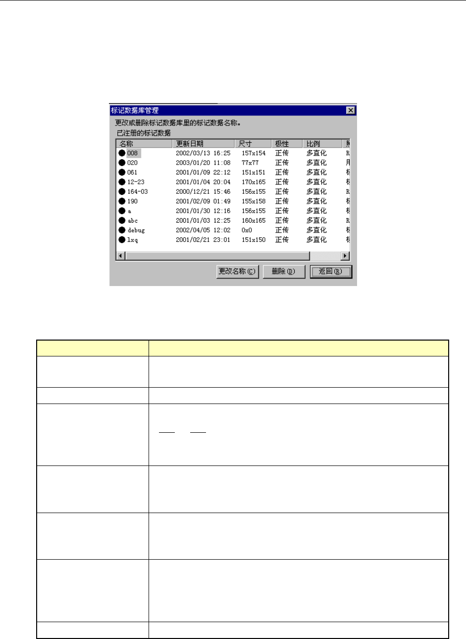 在一览表中显示数据库中储存的标记数据。各项目的含义如下。