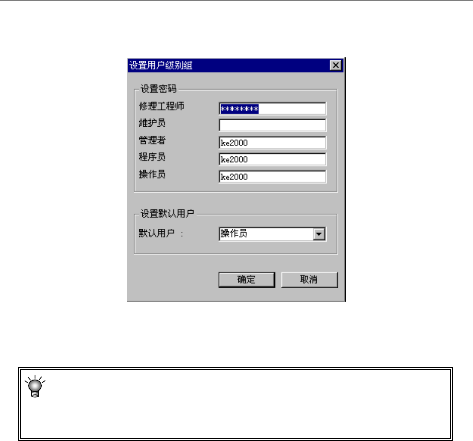 可改变变更用户组时输入的各密码,也可设置默认用户(参见4-2-1-1 用户组变更的“重启动