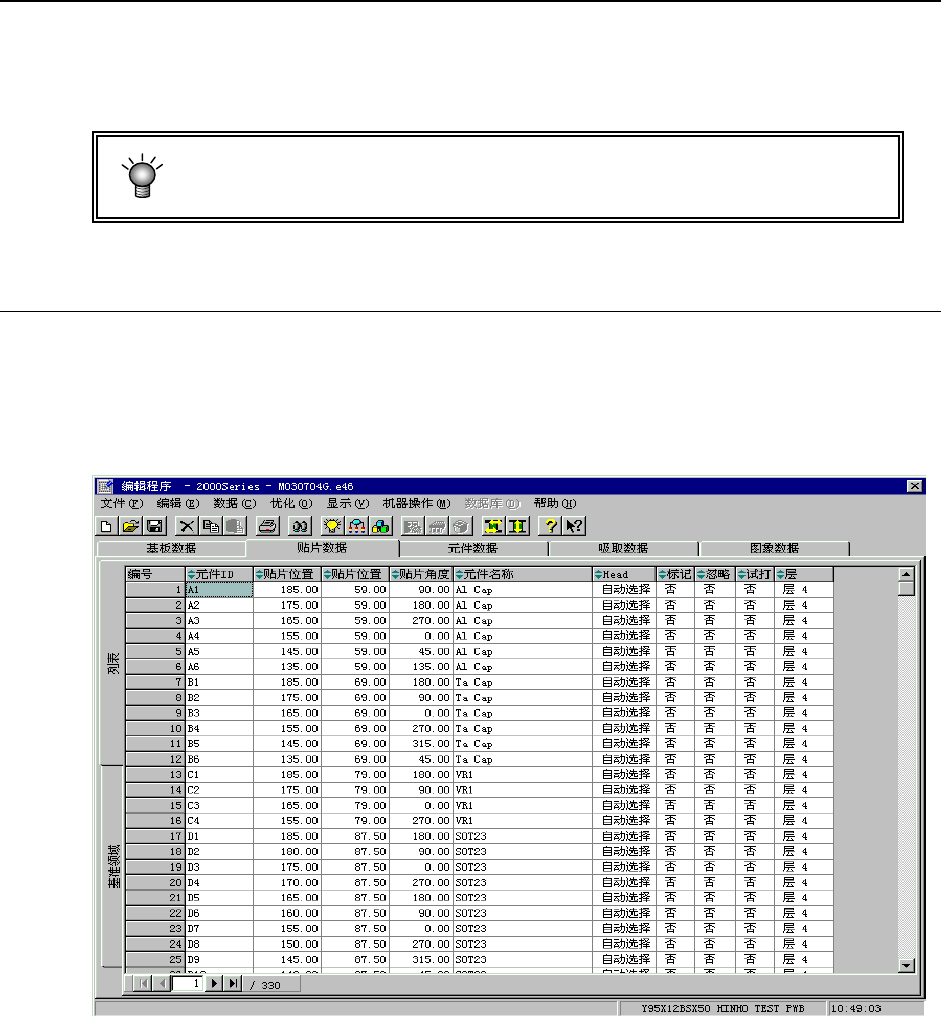 制作基板数据后,单击画面上方的“贴片数据”标签,显示贴片数据制作画面(下图为制作完