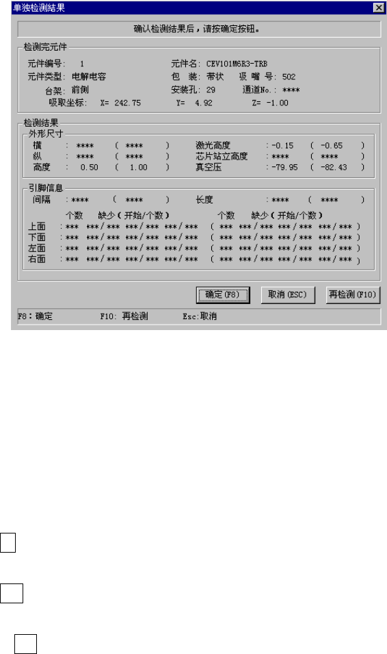 第1部 基本篇 第4章 生产程序制作 ③ 单独检测结果 单独检测结束后,显示如下的结果画面。 图 4.5.4.2.3-6 单独检测结果 (1) 检测完元件 显示元件内容及吸取位置。 (2) 检测结果 显示检测结果的值。( )内表示原来的元件数据值。 未进行检测的项目显示***。 (3) 确定( F8 键) 使检测结果生效, 将结果值储存到元件数据中。 然后返回原来的单独检测条件的设定画面。 (4) 取消( ESC 键) 使检测结果无效,…
