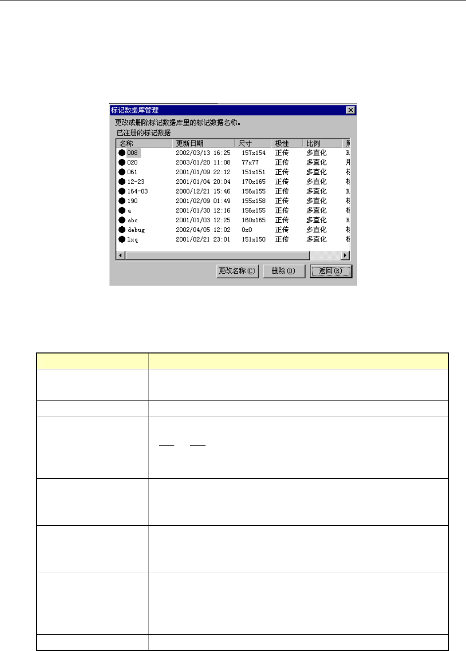 在一览表中显示数据库中储存的标记数据。各项目的含义如下。
