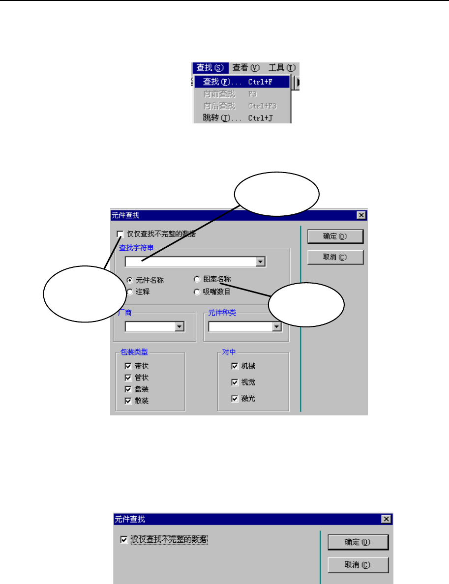 第1部 基本篇 第5章 数据库 5-5 检索 <步骤> 1) 在菜单栏中,单击“查找”/“查找” 。 图5 . 5 - 1 2) 显示如下检索画面。 指定检索条件,单击“确定” 。 选中任一检 索选项 输入要检索的 字符串。 检索未完成 数据时,请点 击此处 需要进一步锁定检索条件时, 请指定厂商名、 元件种类、 包装方式、 对中 (定心) 方法。 3) 检索结束后,显示“元件一览表” ,并 着重显示符合输入条件的数据库 中…