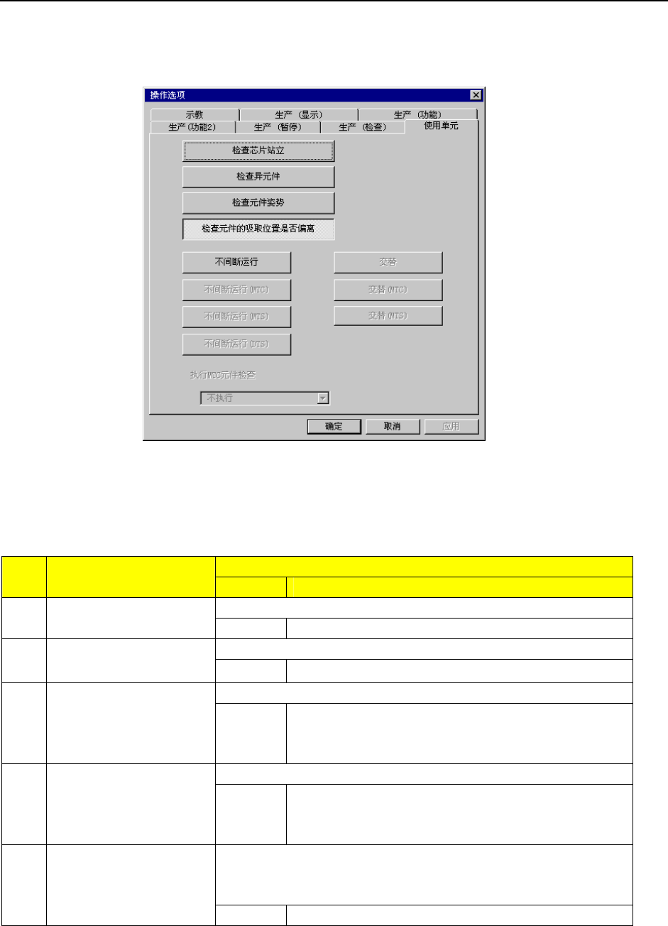 第2部 功能详细编 第7章 操作选项 7-2-7 使用单元的选项设定 在“元件数据”中,对每个元件逐一设定芯片站立检测、异元件检查、元件形态检查。 在该画面上,进行最根本的设定。 在此取消选择后,即使在“元件数据”中选择也将无效。 图 7-2-8 使用单元选项(显示例,KE-2060) 表 7-2-8 使用单元的选项设定项目的细节和内容 内容 序号 项目 状态 运行及详细内容 设定执行元件数据的“芯片站立”检测。 1 芯片站立检测 …