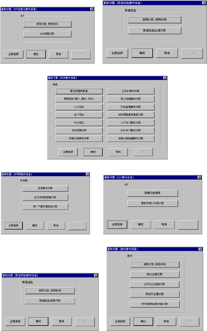 第 2 部 功能详细编 第 10 章 设备运行信息 图 10-5-16-11 SOT 作业信息重新设置画面 图 10-5-16-12 共面性作业信息重新设置画面 图 10-5-16-13 传送作业信息重新设置画面 图 10-5-16-14 非同步作业信息 重新设置 画面 图 10-5-16-15 ATC 作业信息 重新设置 画面 图 10-5-16-16 共面检测信息重新设置画面 图 10-5-16-17 激光作业信息重新设置画面 10…