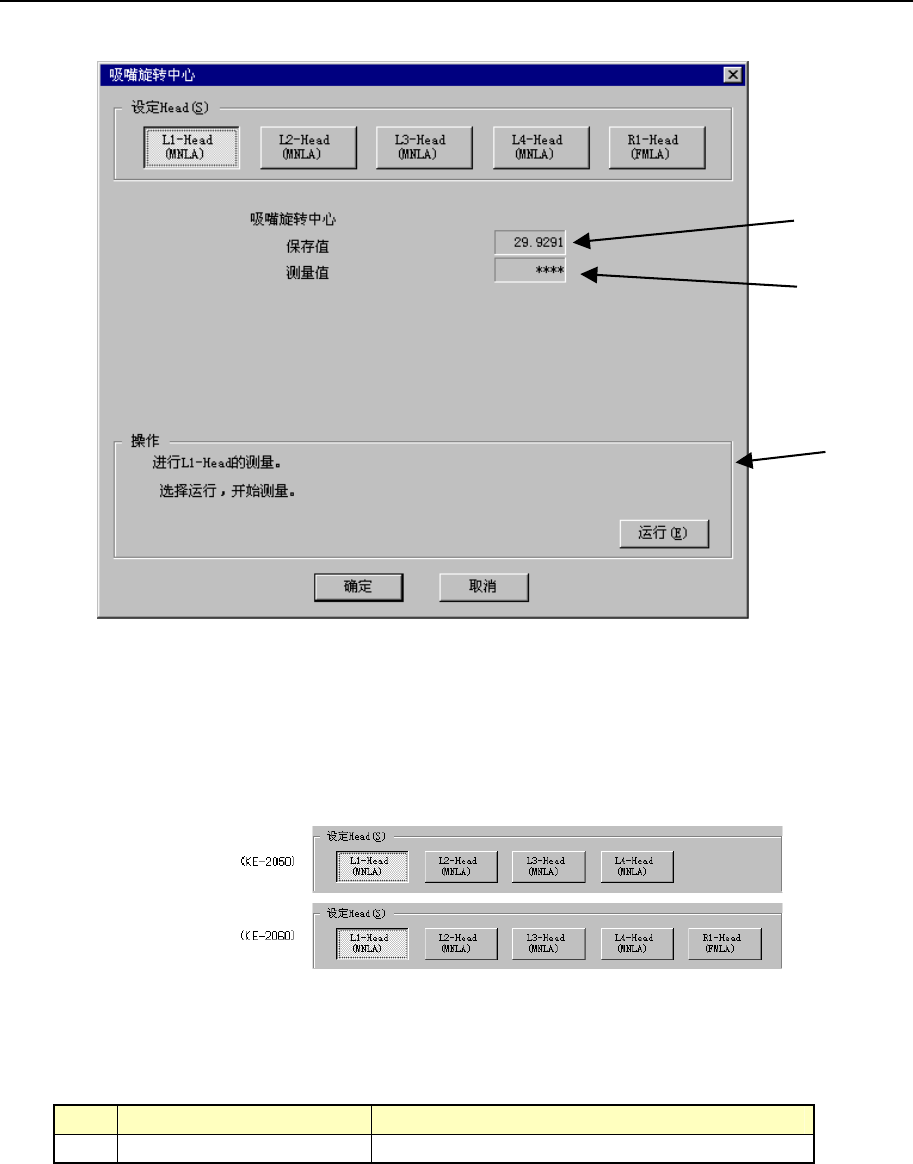 第2部 功能详细篇 第1 1章 自动校准 11-2-3 吸嘴旋转中心 测量各轴的旋转中心位于激光传感器的什么位置。 (设定的吸嘴旋 转中心) (测量到的吸 嘴旋转中心) ( 选择左 1 贴片 头时 ) 图 11-2-3-1 吸嘴旋转中心 设置贴片头 使用单选按钮选择设置对象贴片头。 不能选择没有在机器设置的“使用组件”设置中选择(不使用)的组件。 图 11-2-3-2 (1) 设置项目 No. 项目 设置内容 1 吸嘴旋转中心 由激…