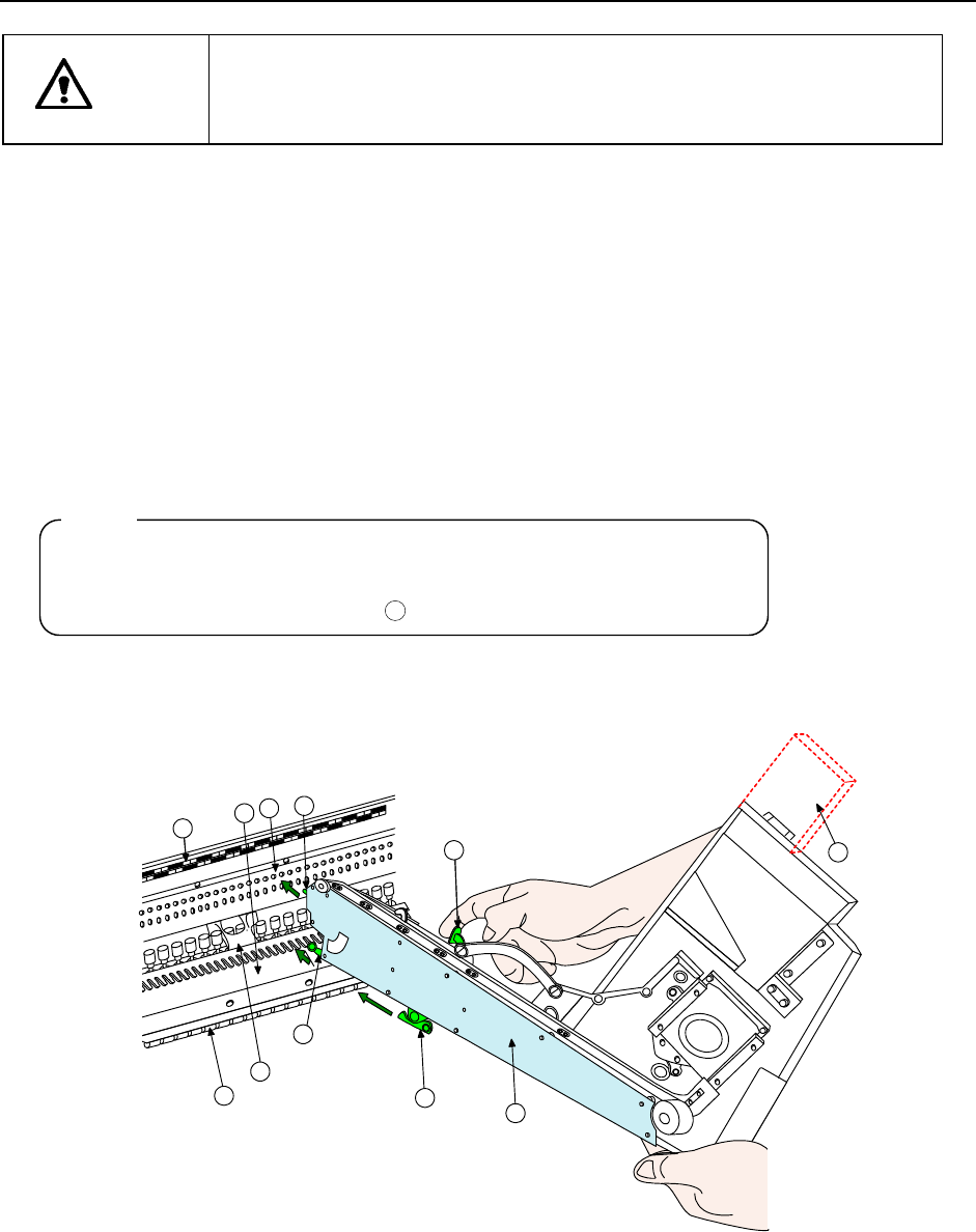 第2部 功能详细篇 第1 2章 选项元件 12-1-3 散件送料器的更换 注意 如在 XY 轴或贴片头正在动作时更换送料器, 散件送料器可能会接触到动作 元件,危及人身或损坏装置。 XY 轴和贴片头正在动作时,请决对不要更换散件送料器。 请务必打开安全护罩后再更换散件送料器。 (1) 安装步骤 1) 将“散件送料器①”的底面放置在“送料台②”上。 2) 滑动 “散件送料器①” , 以 “安装板B⑦” 作为导板, 对准 “带式送料器” 底…