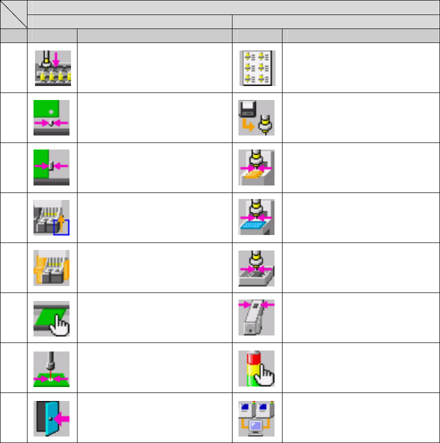 第 1 部 基本编 第 1 章 设备概要 1-3-2-3 机器安装 换页 第一页 第二页 No. 图标 名称 图标 名称 1 ATC 吸嘴分配 登录完毕的吸嘴一览 2 基准销的位置 读取吸嘴数据 3 外形基准的位置 MTC 梭子吸取位置 4 贴片头等待位置 MTS 组装位置偏移 5 使用单元 元件废弃位置 6 基板传送 IC 回收带位置 7 BM 传感器示教 进行坏标传感器的示教。 信号灯 8 退出 返回桌面 。 多工位线 设定与 HL…