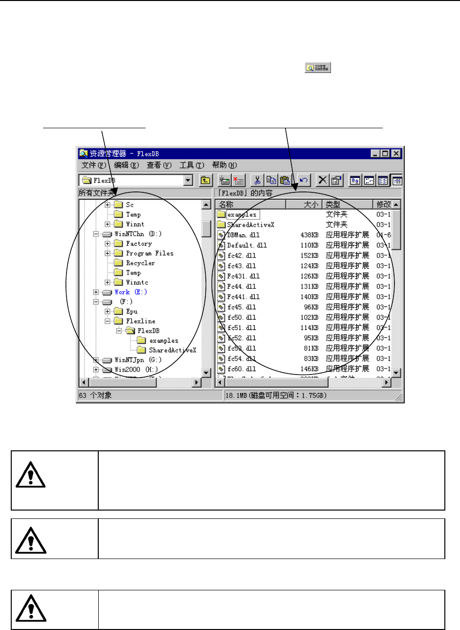 第 1 部 基本编 第 1 章 设备概要 1-4-5 文件管理 使用Windows的Explorer功能进行文件管理的操作。 使用文件夹的建立·删除功能,可以建立·删除文件。 1) Explo rer 的启动 单击“文件”/“资源管理器(Explorer) ”,或按命令按钮 来启动。 2) Explorer 的画面构成 左侧显示阶梯状构造。 右侧显示左侧选定的文件夹内容。 图 1-4-5-1 Ex plorer 画面 注意 Explor…