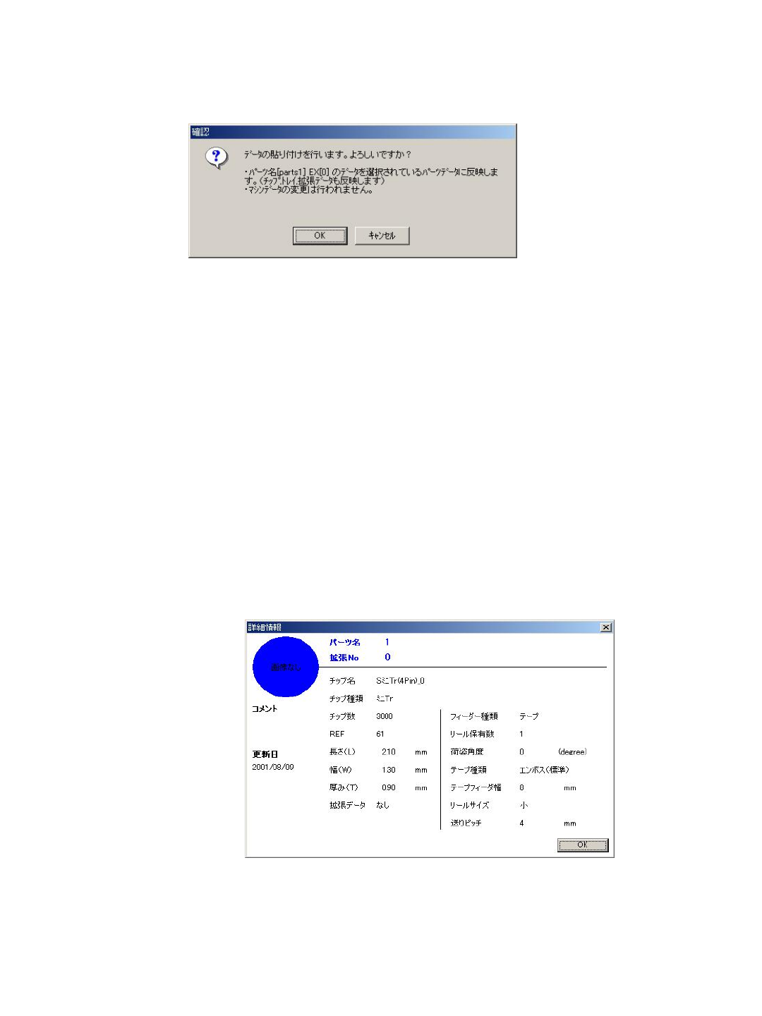 【詳細 操作】 ③数据粘贴 ,下面的信息 会弹出,再次 进行确认。 OK: 开始 COPY 。 キャン セル:取消。 但是, 因为一直保持 COPY 出处的 信息,如只是 变更元件,只 要实行再选择 后的数 据粘贴,就可 以继续了。 到此为止操 作完成。 追加仕様: 要确认 C OPY 的详细情 况,在进行元 件数据表示时 ,可以用以下 功能。 1.选 择菜单中的“ 详细”。 2.。 按右键菜单中 的“详细”。 按下这个 画面中的 OK…