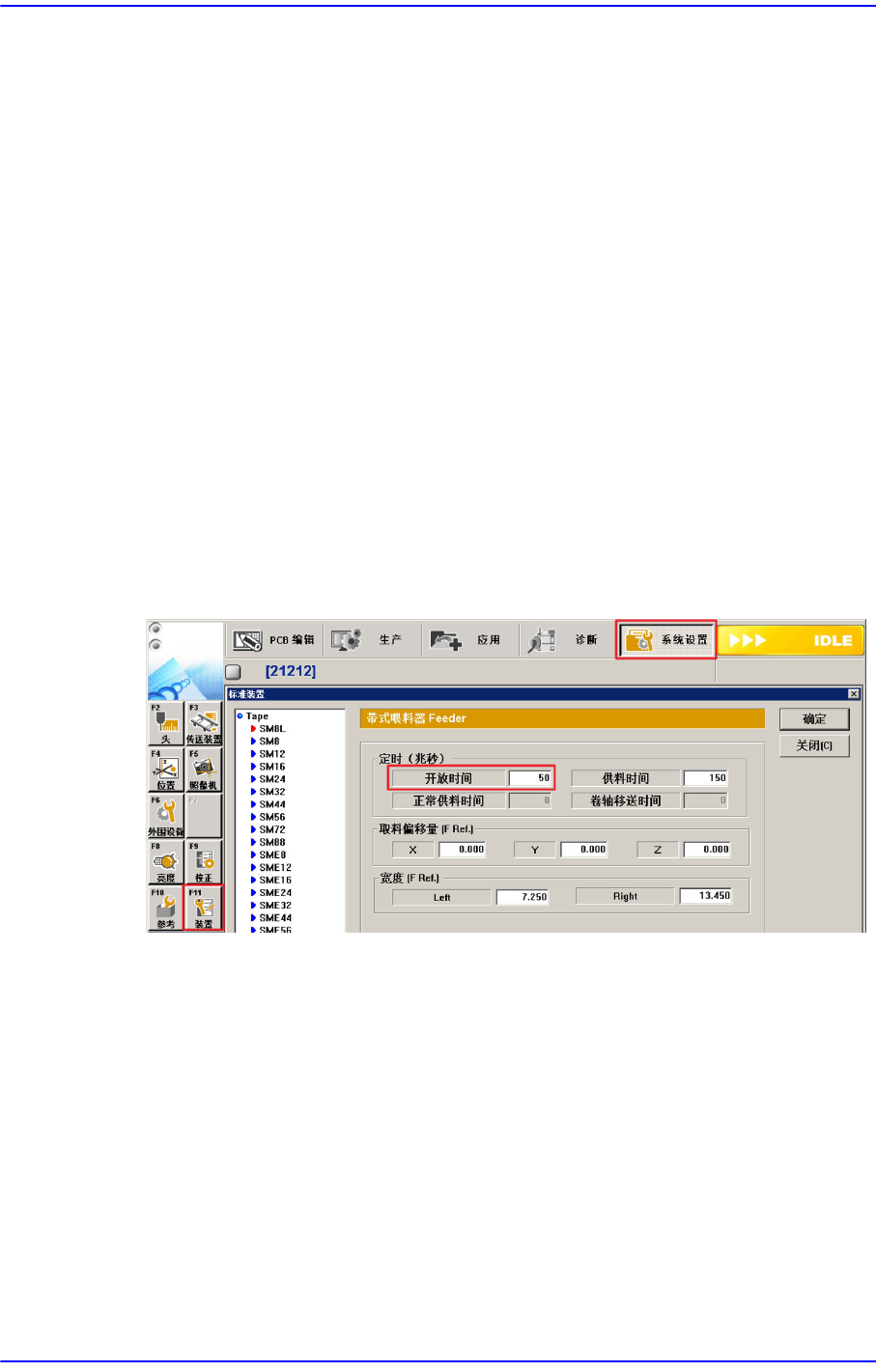 子菜单后,选择对应的Tape Feeder 项目确认对应喂料器的’Timing’值,之后设置